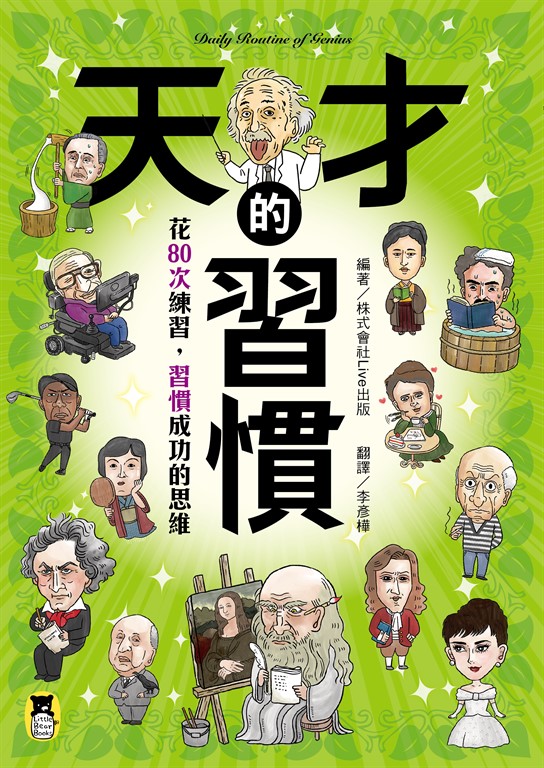 內容簡介 如果能夠訓練自己── 像阿基米德一樣,不論任何時候都持續思考;像南丁格爾一樣,不論對誰都可以毫無畏懼的表達意見;像愛迪生一樣,不論走到哪裡都帶著筆記本;像比爾.蓋茲一樣,每天一定花時間看書;像蕭邦一樣,注重每一個細節;像奧黛麗.赫本一樣,即使不開心也要露出笑容;像女神卡卡一樣, 每天稱讚自己15分鐘 ……練習像天才一樣思考,在日常生活中培養天才的習慣和思維,內化為80個成功的祕訣和心態! 耶魯大學「天才課程」的創立者克雷格.萊特教授,曾經提出歷史上的知名天才都有關鍵的習慣;所謂「習慣」,就是長時間重複做相同的事情,持之以恆的堅持下去──「習慣」會變成「思維」,「思維」決定「行為」,「行為」可以激發「才能」,成為持續的力量,為未來帶來希望。 聽說得過兩次諾貝爾獎的瑪里.居禮,只要想轉換心情就解數學問題;蘋果公司的創始人史蒂夫.賈伯斯,每天都要問自己:「如果今天是人生的最後一天,你會怎麼做?」;創業家伊隆.馬斯克以5分鐘為單位,來規畫一整天的行程安排;棒球之神貝比.魯斯只要站上打擊區,就絕對不會設想三振時的狀況;女神卡卡每天都留15分鐘來稱讚自己…… 每個人對天才的定義可能都不一樣,但是,就算再厲害的天才,想要在世界上功成名就,也必須投入相對的時間,每天、每星期、每個月甚至每年都重複做著同一件事情,藉由習慣的養成,讓才能獲得表現,最終成為世人眼中的「天才」。 本書用傳神的名人肖想畫譜出80個成功的專欄,為讀者揭露80個世界級天才的成功祕訣和心態,列舉分布於學院英雄、魅力領袖、頂尖創作者、超級巨星四個領域的名人,介紹對學術領域有所貢獻的天才科學家、帶領巨大企業或組織邁向成功的天才領導者、堅持從無到有創造作品的天才創作家、在體育界或演藝圈中發光發熱的天才明星,讓讀者知道── 所謂天才的習慣,就是一遍又一遍的做同樣的事,每天、每週、每月、每年……持續下去,俗話說,花21天的練習,養成習慣;80種習慣,80個練習,持續且不間斷的實行,內化為成功的祕訣和心態,找到自己的天賦,你也可能是成功之人! 欄位解說 (1)最佳標語 用一句話說明這個天才是什麼樣的人。 (2)姓名 天才的名字。 (3)天才的個資 天才的生卒年、出生地和職業。 (4)天才的習慣 這個天才擁有什麼習慣。 (5)各項評分 包含「天才的知名度」、「習慣的厲害度」、「讓人想模仿度」,最高為五顆星。 知名度:越多人知道這個天才,星數就越多。 厲害度:執行上越困難,星數就越多。 想模仿度:越讓人覺得「想模仿」或「似乎可以模仿」的,星數就越多。 (6)天才的長相 插畫風格的肖像畫。 (7)習慣說明 詳細說明習慣的內容或特色。 (8)天才的點點滴滴 包含天才的生平事蹟、特徵或趣聞等等。 (9)天才的內心獨白 用全身畫像搭配一句想像中天才可能會說的話(並非真的說過)。 (10)名言佳句 天才說過的金句。 (11)解說 針對名言佳句特別說明。 (12)趣味知識 關於這個天才的小知識。本書特色 ◆專題式學習 每一則都以專欄的方式討論一個天才的習慣,有最佳標語、天才的個資、天才的習慣、天才的評比、天才的長相、天才的內心獨白,詳述每個天才的生平事蹟、特徵和趣聞,補充閱讀素養。 ◆名人自傳故事 收集阿基米德、愛迪生、比爾蓋茲、賈伯斯、馬斯克、J.K.羅琳、老虎伍茲、麥可喬丹、女神卡卡……等名人軼事和趣味知識,搭配活靈活現的肖像畫,人物形象躍然眼前,彷彿閱讀一本天才小自傳。 ◆索引式知識圖鑑 將紮實的知識分門別類,除了在目次就先提供每位天才的習慣索引,每個類別都詳列天才的姓名、年代和職業,建立方便閱讀的索引,有如一部記載成功心法的知識圖鑑。 ◆解決問題的勵志書 閱讀的同時也進行自我覺察和自我成長,相信「只要持續某種習慣,才能就會被激發」,為自己打氣!配合目前最夯的自主學習,是父母會感興趣的主題,適合親子共讀,一起討論並解決人生問題。 ※本書會讓你獲得 ◆付諸行動的力量 ◆活得精采的力量 ◆克服困境的力量 ※閱讀筆記 閱讀重點:名人故事+勵志金句+習慣養成。 閱讀年齡:無注音,適合10歲以上閱讀。 閱讀關鍵字:習慣、習慣養成、名人故事、名人金句。 閱讀素養:自我成長、人生目標、生涯教育。 SDGs目標:SDG4優質教育、SDG17夥伴關係。