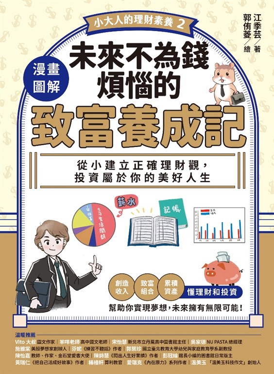 內容簡介 \專為青少年打造的FQ漫畫圖解知識書/懂理財投資,不只能帶來財富,還能夠幫助你實現夢想,擁有未來無限可能性,活出自主人生!★ 全彩漫畫及插畫圖解,情境式+步驟式,讓硬知識變得生動好懂!★ 親子理財暢銷作家江季芸博士全新力作★ 為台灣讀者量身打造,【小大人的理財素養】系列第2彈!就讀國二的小軒,即將迎來期待已久的隔宿露營,但是回到家,聽爸媽討論起最近物價齊漲的新聞,他感受到一股無形的經濟壓力,猶豫著該不該提起露營的事。小軒很困惑,爸媽明明很認真上班工作,為什麼還是每天追著錢跑,也被錢追著跑?自己長大以後,也會過著為錢苦惱的生活嗎?好友阿睿看到小軒如此煩惱,便請擅長理財投資的媽媽為他們解惑。「為了成為有錢人,我每個月都想存點錢,但常常到月底,零用錢就花光了!」小軒道出自己的心聲,也是許多大人正面臨的日常難題……◎ 理財投資,是規劃美好人生的必備工具本書作者江季芸博士,有感於台灣的家庭和正規學校缺乏理財素養教育,導致許多人出社會後,沒有為自己創造財富的能力。她認為,越早開始接觸理財投資越好,因此從成人理財作家跨足兒童理財,規劃【小大人的理財素養】系列,內容力求簡單易懂、接地氣,並符合小孩在不同成長階段的實際需求和生活場景。第1集《跟著晴晴學生活理財》針對國小生撰寫,用輕鬆故事學習如何存錢用錢,獲得眾多好評。第2集《漫畫圖解.未來不為錢煩惱的致富養成記》針對青少年設計,除了建立正確理財觀,也能認識金錢和人生的關聯,學習投資自己的未來。以後,你想成為什麼樣的人、從事什麼工作、過什麼生活?這一切,都和我們從小開始對待金錢的方式息息相關。◎ 7篇漫畫故事╳25則觀念解說,最完整的致富路徑本書共7個篇章,每篇皆從漫畫開始,搭配深入淺出的文字,讓國、高中生奠定25個未來不為錢煩惱的理財觀念,包含:.如何跳脫經濟困境,找到各種收入來源,找到熱情?.只是拚命工作領薪水是不夠的,因為賺得越多,可能會花得越多.擁有一份工作不代表永遠,我們必須學習在自己身上建立其他保障.「開源+節流」及「儲蓄+投資」看似普通,卻是最穩定有效的致富組合.表面上的「資產」,有可能是讓你不斷花錢的「負債」.與其把錢投到別人身上,不如將錢優先投資給自己我們為什麼要投資,為什麼要理財?不投資理財,也能過一天算一天,但只要善用財富的力量,就可以幫助你實現目標、提升生活品質,未來不被工作綁住、不被債務追著跑,當生活多一點保障,你就有更多機會去做自己真正喜歡的事!【適讀年齡】無注音,適合國小高年級以上閱讀。