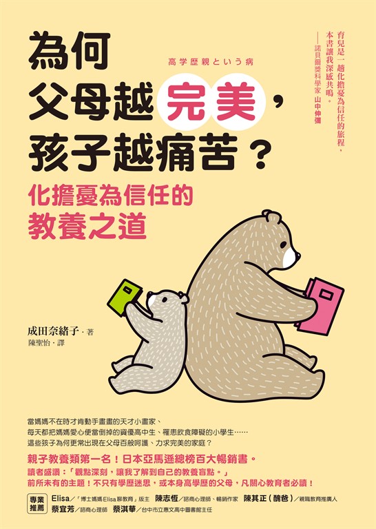 內容簡介 為什麼父母這麼努力,還是在教養路上屢屢挫敗?為什麼在乎孩子課業的父母,容易養出「啃老族」「繭居族」?為什麼學歷越高的父母,往往會越孤獨?作者身兼腦神經科學家及教養諮詢專家,發現有越來越多高學歷、或有學歷迷思的父母前來求助,他們百般呵護、為孩子提供最好的資源,但親子的衝突並未減少,反而問題層出不窮。過度擔憂、干涉、溺愛,是許多現代父母易犯的教養錯誤。無法全心信賴孩子、想要孩子完成自己未達成的夢想或成就……最後只能哀嘆:「為什麼這孩子會長成這副德性呢?我都已經幫他這麼多了。」用具體案例說明父母的盲點,提供實際解方!作者在書中舉出各種教養困境實例,說明只要改變觀點,問題都會出現驚人的改變!.要常對零歲幼兒說話.在培養智能腦和心智腦前,先培養體能腦.有比學才藝更重要的事.比起自誇,多說自己的蠢事,更有助於孩子自我肯定.孩子沒有叛逆期才需要當心.無法信賴孩子的三個原因.學歷迷思父母的「雪恥型育兒」.金錢觀偏差的高學歷父母專業推薦:推薦給陷在教養焦慮之中的父母,劃對重點育兒,事半功倍,還可以換到良好的親子關係。──「博士媽媽Elisa聊教育」版主Elisa「高學歷父母」正成為這個世代孩子情緒問題的最大因素,本書點出這個世紀的教育痛點,邀請大家閱讀,一同關注孩子的未來。──台中市立惠文高中圖書館主任蔡淇華讀者五星好評:★完全擊中職場媽媽的心聲!當我買超商食物,就會被說「你不自己做便當嗎?」我做了便當,又被說「菜色不豐富一點怎麼行呢?」當爸媽自己在競爭意識中長大,他們也會如此看待孩子。希望更多人讀這本書,能停止過度干涉。★推薦每個父母必讀!我終於知道為何我父母會這樣對我了!★我本來相信為子女操心是父母的天職,讀完這本書才發現我錯了,這樣只會帶給孩子無謂的壓力。★我原本以為這是一本反對高學歷父母過度保護子女的書,但恰恰相反,他傳達出作者對高學歷父母的期望。受過高等教育的父母擁有更高的經濟實力和智力,能夠更自由地養育子女。教養最困難的不在於經濟,而是父母的全心信任。★這本書讓我了解自己的思考盲點、能進一步調整心態。不論是不是高學歷,都推薦一讀!★完全擊中職場媽媽的心聲!當我買超商食物,就會被說「你不自己做便當嗎?」我做了便當,又被說「菜色不豐富一點怎麼行呢?」當爸媽自己在競爭意識中長大,他們也會如此看待孩子。希望更多人讀這本書,能停止過度干涉。★看到書名我就對它很好奇,所以我預購並一口氣看完了。我真的很高興能讀到它。★日益增加的教育選擇讓我煩惱不安,但這本書讓我鬆了口氣,更能專注陪伴孩子!★無論你是否受過高等教育,如果你不確定與孩子互動的方式或希望改善自己的方式,都建議閱讀這本書。