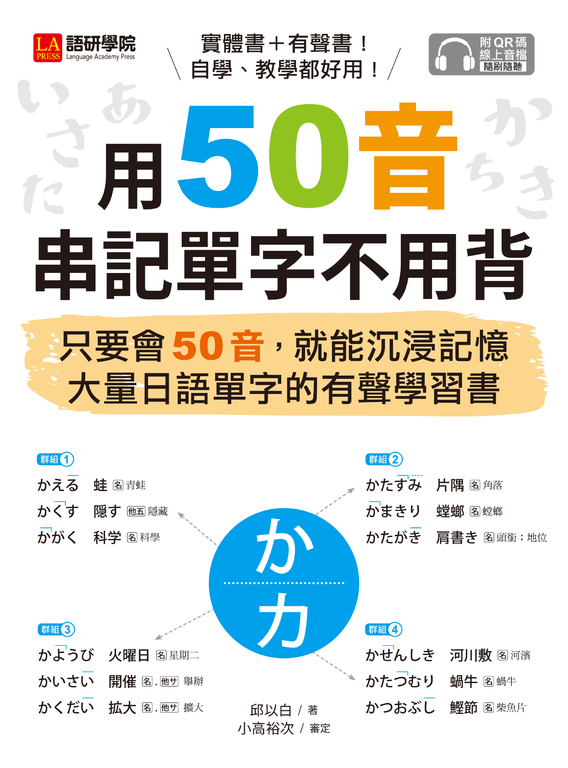 內容簡介 讓你「用看的」、「用聽的」都能不間斷的記日語單字一個音連串記憶,打破傳統憶記憶藩籬!搭配許多人都耳熟能詳的日本童謠、民謠音樂,及用所學單字編寫的趣味歌詞除了輕鬆記單字,還能用學過的單字來造句!教學老師也能用這種新式教法讓學生大量記住所需單字幽默、逗趣的成串單字記憶!讓單字記憶不再無趣!保證學得開心,又獲得檢定單字實力!!自我學習或拿來當教材都很實用!平易近人的設計讓你學得輕鬆、學得開心、還能學出考試實力,隨時隨地,效果滿分。●一連串的單字記憶,學會一個日語假名=記住一串日語單字本書的編排精心規劃,採用相同發音的假名延伸聯想的方式,只要學會一個假名,就可以迅速延伸到其他字詞,跳脫一般傳統單字書的限制,達到最快速的記憶聯想!●群組式韻律記憶,好唸又好背每課以同一假名為主要學習基礎,在群組式的記憶上,同群組的練習仿唐詩般的相同韻腳設計,只要反覆的唸,就會發現它可以唸得很順,不再生澀難記。●活潑的背景音樂搭配,讓記單字不再索然無味書中活用了大腦最愛的學習方式,以讓人熟知的「桃太郎(ももたろう)」、「海鷗水手(かもめの水兵さん)」等日本童謠、民謠歌曲切入,讓讀者「把單字當歌詞看」、「聽的到人唱」、「自己也能哼」、「快樂地記在心裡」,用最妙的方式,把學習給簡單化。●奠定未來的日檢能力日檢的分數與日語單字的記憶量有極大的相關性,書中大量精選了相關的用字,要讓日語學習者能夠學得實用,又能學出考試能力,一石二鳥,打造出競爭力強的日語能力。【QR碼音檔特色】別讓超無聊的學習音檔練習摧殘你的學習興趣!還在一個字一個字的記單字嗎?又無趣又不易記,別傻了~!利用本書如有聲書一般錄製的音檔,讓你解放雙手,就算不拿書也能用耳朵記單字,在沉浸式的體驗中,單字記得快又好:● 貼心的練習速度我們採正常速一次、完全分解一次,遇到促音時以特別音效表示。再回到正常速一次,讓學習者即使不用看書也能清楚聽出單字如何拚寫。● 擊敗促音的困擾日語學習者學習聽講時最苦惱的莫過於促音的存在。分解音時,如果出現了需要停一拍的促音時,就會聽到剎車聲,提醒讀者,該停頓囉!● 幽默逗趣的記憶歌詞創造力豐富的作者把學過的單字寫成幽默逗趣的記憶歌詞,讓日語單字的記憶歷久彌新。● 跟著日本人都耳熟能詳的民謠童謠音樂,用唱的把單字及句子學起來音檔製作使用很多人耳熟能詳的日本童謠、民謠音樂,在動力活潑的背景音樂中,搭配各種有趣的記憶歌詞,雙管齊下學習,效果絕佳。 ● 方便的QR碼線上收聽及下載系統書內音檔全部以QR碼掃描方式提供,只要用手機一掃就能聽。此外,也提供可將全書MP3一次完整下載的QR碼,不需註冊會員,或額外安裝自己不熟悉的播放APP才能聽,省去每次聽音檔都要掃描的麻煩。(註:打包下載檔案為ZIP壓縮檔,請先安裝解壓縮程式或APP再行下載,由於iOS系統對檔案下載的限制,iPhone用戶需升級至iOS 13以上,方可使用全書完整打包下載連結。)本書特色◆特點一:一個音記取大量單字一個單元以同一假名來激發聯想,同時記住其他具有相同假名的單字。◆特點二:主要單元的強力連鎖記憶為了應付傳統背單字一背就忘的困擾,45個主單元裡,每個主單元分為三個部份,第1部份收錄了25個具有同一假名的單字,這些單字在第2部份串成了例句,第3部分則串成了歌曲,強力的連鎖記憶,想要不記得也難。◆特點三:用語萬花筒輕鬆看日語是注重情境式的語言,有很多字是「表裏不一」的,單元中有些特別的單字,本書會在練習「表面」的同時,並解譯它在「裏面」有什麼不一樣。◆特點四:變化後的動詞一樣輕鬆掌握日語的動詞變化常常讓讀者傷透腦筋。書中貼心的將所有出現的動詞變化加上線框標註,並讓他們「現出原形」。若學習者基礎未深,也能了解每個動詞的原形。◆特點五:清楚的假名辨識在每個日語漢字的上面都有清楚的假名標示,即使看到生澀的漢字,也能保證會說會唸。◆特點六:精采豐富的副單元本書有58個副單元,每個副單元都有16個圖解的單字及18個漢語單字。圖解單字讓你把情境的日語看得一清二楚。◆特點七:用於生活、養成檢定實力一石二鳥所選單字遍及日常生活常見單字,除了能應用於生活外,亦能藉由本書學得日語測定約2~3級之間的單字實力。◆特點九:方便的索引書中的索引,可以迅速的幫助讀者查到想學的單字。