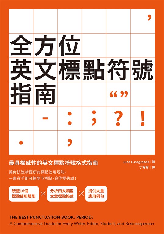 內容簡介 洛杉磯時報資深專欄作家編撰,最具權威性的英文標點符號格式指南,全方位統整不同類型文章的標點使用規則,不須再為眾說紛紜的用法迷惑,一本立即搞定所有煩惱讓你能自信精準下標點,大幅提升文章品質!比較下列兩個句子,請問何者為正確用法?He is a young single person.He is a young, single person.兩者都是正確的,但在語意上卻有所不同。若寫作者想表達他是一位單身人士,也正好很年輕,則不應加逗號。但若寫作者想表達他是一個既單身又年輕的人,意即同時擁有單身和年輕這兩項特質,則可以加逗號。anti-bias、antibias 哪種寫法是正確的?兩種寫法都是對的,但第一種有連字號的用在新聞及商業文章中,第二種則用在書籍、學術及科學文章中。所以標點符號有時不只關乎到使用的正確性,還會因文章體例不同、寫作者想表達的含義、整體文章的節奏及連貫性等而產生變化。本書特色【特色一】明確列出所有英文標點符號的使用規則,讓你徹底理解標點的奧妙本書提供全面性的標點符號參考準則,每章討論一個標點符號,詳細說明該符號的基本使用規則,點出因有無標點符號所導致文意不同的情況。比較不同文章格式標點規則不一致之處,讓你能嚴謹下標點,建構通順易讀的好文章。【特色二】一次統整書籍、新聞媒體、科學、學術寫作四大類型文章標點格式涵蓋四大實用文章格式,為不同類型的寫作者整合全面性的標點符號編輯規範,詳實記載各體例文章應遵循的準則。即使是有爭議、落在灰色地帶的標點問題,也提供各大出版社專業編輯的偏好作法,作為參考依據。【特色三】提供大量應用例句,讓你迅速掌握並應用標點符號透過簡單明瞭的例句,輕鬆抓住章節核心要點,因應不同語境及文章架構,選擇最合適的標點規格。對比正確及錯誤例句,指出會改變文意或誤導事實的常犯標點錯誤,並提供校正方法。【特色四】表格整理標點符號參考資料,方便檢索、一目了然!清楚列出許多人易混淆的常見單字、片語、專有名詞的標點用法,以表格統整為一套簡潔的規則系統,隨時輕鬆查找。也能一目了然相同單字,出現在不同體例文章中的標點規則。專業推薦周昱翔│台大外文系助理教授、《英文閱讀技術》作者洪欣Olivia│英文補教名師黃玟君博士│臺科大應外系副教授廖柏森│國立臺灣師範大學翻譯研究所教授 暢銷英文論文寫作教科書作者標點符號雖是「小道」,但在寫作上「必有可觀者焉」,不僅能使句意邏輯清晰,還能賦予文字節奏和情感。可惜許多人對於英文標點缺乏系統性學習,只是憑藉直覺和習慣來使用,連犯錯都不自知。而本書由美國洛杉磯時報資深專欄作家編撰,透過大量範例和詳細解析,深入淺出地展現了精確使用標點符號的藝術,可引領臺灣讀者提升英文寫作品質。 廖柏森