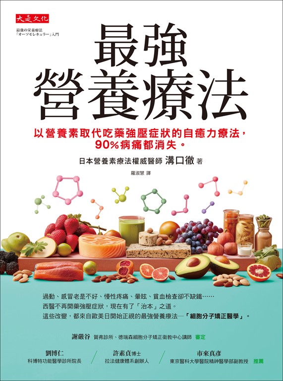 內容簡介 ‧陷入憂鬱,不是開藥改變血清素,而是補充血基質鐵、B群。 ‧賴床、失眠、腸躁腹瀉,不是甲狀腺機能低下,限醣加運動就改善。 ‧異位性皮膚炎、停經,補鐵、B12,多吃有油花的肉,根治。 ‧吃啥都過敏,禁忌一大堆?其實是腸道問題,吃麩醯胺酸後大大改善。 過動、感冒老是不好、慢性疼痛、暈眩、貧血檢查卻不缺鐵…… 西醫不再開藥強壓症狀,現在有了「治本」之道。 這些改變,都來自歐美日開始正視的最強營養療法──「細胞分子矯正醫學」。 什麼是細胞分子矯正醫學? 就是讓身體裡面的分子(各種營養素)濃度,維持在最佳平衡狀態, 藉此提高身體機能,讓病痛痊癒。其中關鍵,就是補對營養素。 本書作者溝口徹,從小就有異位性皮膚炎及肥胖問題, 家人也深受癌症、暈眩所苦,常常病急亂投醫, 直到他發現「細胞分子矯正醫學」,單靠飲食改善,竟讓病痛痊癒。 現在,他以「細胞分子矯正醫學」為基礎,獨創拯救萬人的自然飲食療法, 依據血液檢驗數字評估,精準判斷病患到底少了什麼營養素,然後補足── 只靠吃對食物、營養素、補給品,就能抗老化、緩解疲勞、提神好眠、 抗癌、助孕,讓90%以上的病痛都消失: ◎細胞分子矯正的新概念:健康取決於你吃了什麼 ‧均衡飲食卻早死?因為:脂肪酸 傳統觀念都要大家少吃肉,以免膽固醇過高。 但只吃肉的格陵蘭島因紐特人,得心臟病的比例卻比歐美人低,為什麼? 關鍵就在:血中脂肪酸的比例。吃對「Omega-3」,就能抗發炎、抗過敏。 在細胞分子矯正醫學中,到底該如何正確攝取脂質、膽固醇? ‧限制醣類,治療效果加倍 白飯、麵類、麵包、甜食,吃多少最健康? 成人的糖尿病、自律神經失調、恐慌、焦慮、憂鬱,通通和「血糖」有關; 細胞分子矯正還告訴你:唯有限制醣類、增加蛋白質,才能啟動神奇自癒力。 ◎健康飲食是「吃對分子食物平衡」 ‧別再誤解脂質,真正可怕的其實是醣 比起脂肪,醣類攝取量偏高,死亡率更高; 適度的不飽和脂肪酸,可降低身體的發炎反應。 而專家都說要多吃的蔬菜、水果和豆類,其實少吃也沒關係。 ‧蛋白質有「自噬作用」,健康更惡化 一旦蛋白質殘留於腸道,大量的腸內細菌就會發酵、腐敗, 而這就是你腹部脹痛的原因。 還有維生素C、D、E,怎麼吃最有效? 抽血時一般醫師都忽略的9項數據,其實是判斷健康與否的關鍵; 分子矯正的血液檢驗評估告訴你:就算數字是正常值,並不代表健康。 連醫師都在學的分子矯正醫學,助孕、抗老化、抗癌,通通有效。