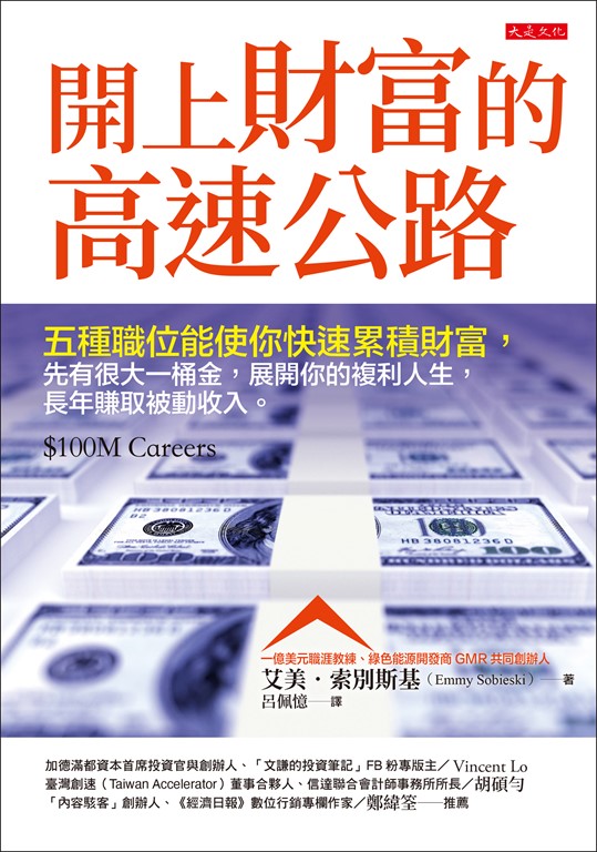 內容簡介 ◎你想在新創公司當業務,還是在大百貨零售通路商上班? ◎只要好好上班,便能慢慢在組織位階中爬升?公司重視的不是努力,而是價值。 ◎想創業當老闆,不能只懂技術專業,厲害的執行長都曾是業務。 本書作者艾美.索別斯基,管理過全球曾經排名第一的 尼可拉斯艾波蓋特全球科技基金(Nicholas Applegate Global Technology Fund), 並在農民保險公司(Farmers Insurance)管理過債券基金、能源基金和科技基金, 這段資歷讓她在30歲左右就達到財富自由。 她不只自己成功,也幫助很多人成功,她現在是「一億美元的職涯」教練, 幫助很多學員在30歲左右,身價就破億。 這本書要介紹的致富方法, 不是多數人在做的存股、理財賺取被動收入這條路, 作者認為,在採取這些理財方法前,你得先有很大的一桶金, 複利才會有顯著效果。 所以,你需要一條通往龐大財富的高速公路,這裡有五條路供你選擇: ◎投資你最了解的產品和人──擔任創投與創投分析師的角色 創投在做啥?得看非常非常多的募資簡報, 然後把公司的錢配置在未來最可能賺錢的企業身上。 想進這行,怎麼開始? 先從投資銀行做起,三年後轉職到創投公司。 如果你已有一筆錢,當然可以直接跳進新創事業,當天使投資人: 投資你最了解的團隊,讓他們幫你賺更多。 ◎擁有或加入一間「擁有公司的公司」──私募股權 私募股權則是名下擁有未上市公司的公司, 但這行幾乎只從頂尖投資銀行挖角,像是高盛、摩根士丹利, 而且在這行表現很好的人,都是喜歡數學運算、做財務模型的人。 不是這種人才?那麼 你一定更好奇,擁有未上市公司的股權要如何賺到錢?(請看第六章) ◎老方法,新規則──擔任避險基金操盤人(團隊) 這行起源於不想曝險的有錢人,現在則有越來越多機構(如大學捐贈基金), 想完全避險但又想賺錢──所以找人來管理基金,工作重點是風險調控。 在這行,每週工作80小時是常態,但當你有名氣到可以成立自己的避險基金, 一年就可賺2億美元。 ◎掌握權力與自由──自己開公司 想成為決策者、不想被管東管西,開公司是個好選擇, 但新創公司就像嬰兒,得全心全意照顧(據統計,有9成新創最終會倒閉)。 想自己開公司,不能只懂專業,還要有業務經驗, 亞馬遜的貝佐斯、微軟的比爾.蓋茲……厲害的執行長都曾身兼業務。 ◎多重財富金流──當企業董事 這是最輕鬆、最不費力的賺錢方式:別人工作你賺錢,還能加入多個董事會, 但這不是你自己能應徵的工作,得先長期經營人脈與專業,讓企業找到你。 作者幫你畫出三條成為董事的最輕鬆路徑。 很多人都在談累積「被動收入」, 但你得先有很大的一桶金,複利才有顯著效果, 這裡有五種職位能快速累積財富。