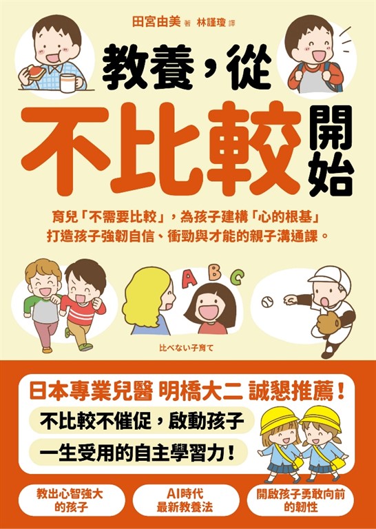 內容簡介 ╲不比較、不催促,啟動孩子一生受用的自主學習力╱「不比較」教育心法,是「信任」而非「放任」當孩子的天生特質被認同時,「堅定心智」及「行動力」將隨之成長!日本人氣兒醫--明橋大二醫師誠懇推薦!孩子在成長的過程中,是否曾出現:做事不積極、老是叫不動?訂定計畫卻常常無法按表操課?遇到困難挫折就想逃避?只肯做他想做的,推託理由一大堆?想一想,您經常對孩子說這些話嗎?「我都是為你好,以後你就知道了。」「快點!要來不及了!」 「你應該要變得更強。」 「要是你再努力一點就好了!」是否曾擔心孩子長大後:屆齡卻無法自立,依舊在生活上依賴父母?缺乏人生目標,對什麼都沒興趣,甚至變成不想努力的「躺平族」?>>>這些問題最重要的基礎,就在於是否有為孩子建立良好「心的根基」<<<★父母不經意流露出的情緒和話語,可能瞬間摧毀孩子自信的城堡★孩子在成長摸索的過程中,一定會有困惑、失敗、挫折的地方,父母也會在意孩子的學習情況與考試成績,不自覺的拿來跟其他孩子比較,很多時候,父母太想好好教育孩子,總會以上對下教導或激勵的方式表現,但這樣的做法是單向的付出親情,只會有反效果。 如果父母未能表達同理心,與孩子溝通,即時提供最需要的關愛與疏導,久而久之,孩子容易變得情緒起伏大、自信心脆弱,不敢挑戰、逃避面對困難,不喜歡自己卻也無法欣賞讚美別人,可能會影響未來長期的人格發展。「心的根基」就像一棵成長中大樹的「根」,只要健康穩固的扎牢在大地之中,即便面對風雨也不會倒下,最終結出繁盛的果實。父母該如何為孩子建立「心的根基」呢?最重要的作法就是>>>不與他人比較,真心喜愛孩子的優點和缺點,全然接納孩子的一切!「信任」而非「放任」,真心讚美和過度稱讚只有一線之隔,不妄下評斷也不一味鼓勵。讓孩子確實的感受到>>>就算做不好也沒關係,爸爸媽媽一樣愛著他,在滿滿的愛、信任與安全感包容下長大的孩子,才能培養出無懼失敗、跌倒了再站起來的生存能力。★丟掉「和別人比較」的心態,給孩子「容許失敗」的空間★當孩子出生那瞬間,父母都曾經為了小小生命而喜悅感動,只盼孩子健康平安,但這樣的心情卻漸漸變了調,因為只要把孩子的成長和其他孩子比較,難免會產生得失心,心情也跟著起伏不定。日本知名家庭教育專家長期探討以孩子自尊心為主題的研究調查, 提出「不與他人比較」教育心法,設計9大生活情境及實用具體的對話練習。將父母的期待轉化成孩子自信向上的動力,趕走腦子裡悲觀消極的思想小怪獸,讓孩子由內而外建立自信,擁有不怕挫折、勇敢向前的韌性!★父母必知!引導出孩子的最佳表現【補習班的挑選重點】培養良好「心的根基」,課外教育的選擇也很重要!若是讓孩子參加了不適合的補習班,可能會反倒使成績下滑,甚至降低了想用功讀書的意願,因此,建議家長在為孩子挑選補習時要謹慎檢視,才能讓補習班成為孩子的助力,因此在挑選補習班時建議留意以下幾點:1、 釐清補習的目標,例如是加強課業或是準備升學考試。2、 了解補習班的特色,對於考上目標學校是否有完整對策等。3、 不被「成績大幅提升」這類廣告或宣傳標語所迷惑。4、 確認交通方式及周圍環境,周邊的治安問題也要多加留意。5、 事先詢問缺席的處理方式,能看出補習班對教育的熱忱與否。6、 了解月費以外的細項費用,例如講義費、模擬考費用等。7、 對於孩子的學習狀況,老師是否能提出具體對策。★培養自律感!避免孩子網路成癮的【3C教養守則】時至今日,孩子使用手機或3C產品已成了一個嚴峻問題,使用3C的時間愈多,用功時間相對就變少,但是手機或3C產品已與生活緊密連結,對於孩子使用方式,家長該如何提供協助,才不會導致孩子的學習力下滑,減少與家人的溝通呢?1、 透過親子共同討論,將訂立規則的主導權交給孩子,培養自律感。2、 彼此充分時間限制並執行,當孩子遵守規則時要適時稱讚。3、 帶著孩子一同體驗,共享現實世界的樂趣【本書特色】★Step by Step日常對話練習,幫助孩子提升自我認同每個章節設計開放式的圖表和問卷,引導家長落實「不與他人比較」的重點複習,帶領孩子從「自我價值」的角度出發,邁向自我肯定的成長道路。★開啟溝通開端,打造「心的根基」「照顧自己的感受」是培養自信的起點。只針對問題提問、傾聽感受,就算孩子不說話,只用表情或動作來表達,溝通就成立了,請務必包容這個狀態。★讓孩子從「叫不動」轉變為「主動去做」的積極開關孩子提問的時候、沉浸專注於某件事的時候,其實是擴展好奇心廣度、養成鑽研探究習慣的絕佳時機點! ★讓孩子學習克服失敗挫折遭遇失敗,對結果最感到失望的人,其實就是孩子自己,家長要做的不是幫孩子處理後續,而是稱讚他挑戰的勇氣,引導孩子看見自己的優點,包容自己的缺點,勇於面對和表達自己。★因材施教,迅速提升能力的正向語法家長的評語會為孩子貼上標籤。浮躁好動、動作慢吞吞、優柔寡斷、個性頑固、喜歡找藉口、調皮搗蛋、粗心、內向等,每個孩子特質不同,因材施教,用不同的正向語法,就能讓「心的根基」更加強健!【暖心推薦】王意中|王意中心理治療所 所長/臨床心理師尚瑞君|親子暢銷作家、講師陳志恆|諮商心理師、暢銷作家胡展誥|諮商心理師 周彥君|臨床