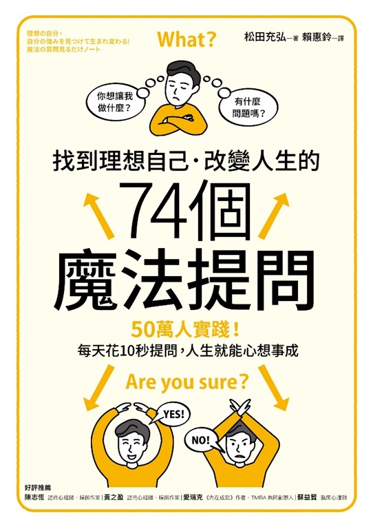 內容簡介 每天10秒提問,突破困境、心想事成!改變50萬人的魔法提問「我不知道自己擅長什麼、總覺得沒有過人的才能」「我不知道自己喜歡什麼,很多事不討厭卻也說不上喜歡」「可以把喜歡的事情變成職業嗎?」「雖然想要有一番作為,卻連要做什麼都不知道」很多人的內心常常會浮現這些疑問,雖然說不上是巨大煩惱,但每當出現這些念頭時,就會陷入自我否定或是沉悶不已的情緒之中,要如何找到人生的解答呢?作者松田充弘非常理解這些困住人生的小聲音,他發現只要透過簡單的自我提問,就可以鬆綁卡住的念頭,重拾人生的主導權。他已實踐本書的「魔法提問」15年,並幫助許多人在工作、學習上突破困境、翻轉人生。▍什麼是「魔法提問」?「魔法提問」是作者獨創的一套心法,並列出74個具體的引導方法,只要利用簡單的自我提問,就能激發出個人潛能與動力,並喚醒行動力。「魔法提問」將以4個階段進行基礎提問:【階段1:是什麼?】先弄清楚你要面對的課題。【階段2:真的嗎?】確認自己的真實想法。【階段3:所以呢?】思考達成目的後,以及解決課題後能得到什麼。【階段4:該怎麼做才好?】該採取什麼具體的行動、在什麼時候實行。▍1日10秒✕74個魔法提問,找到個人優勢,活出理想自我你是不是有過這樣的經驗,看到很多網路上的分享,也跟著買了自己用不到的東西?在這個資訊氾濫的時代,往往一不小心就被外在的聲音影響,做出錯誤的判斷,甚至失去了自我。透過74個魔法提問,可以回到內心真實世界,更加敏銳地察覺自己的心情,並找到真正想做、也很擅長的事情。【舉例說明】「你的優勢是什麼?」每當有人問你這個問題時,是否往往回答不出來,這是因為你站在「自己的角度」思考,只要換一個提問方式:「你能為對方做些什麼?」答案就會呼之欲出! 「我可以運用設計軟體,幫您把版面變得更活潑有趣」 「我很會比價,可以幫你找到最優惠的方案」重新改變思考路徑,找到新的方向,這就是魔法提問的力量與魅力!