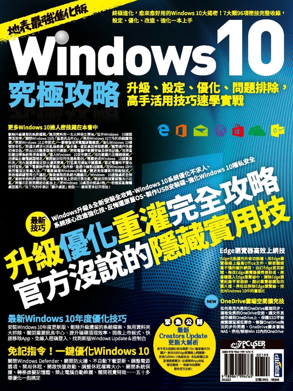完整收錄安裝升級、優化加速、安全強化、系統神改、介面改造、OneDrive雲端硬碟、Edge瀏覽器活用技,更緊急追加2017微軟最新「Creators Updat