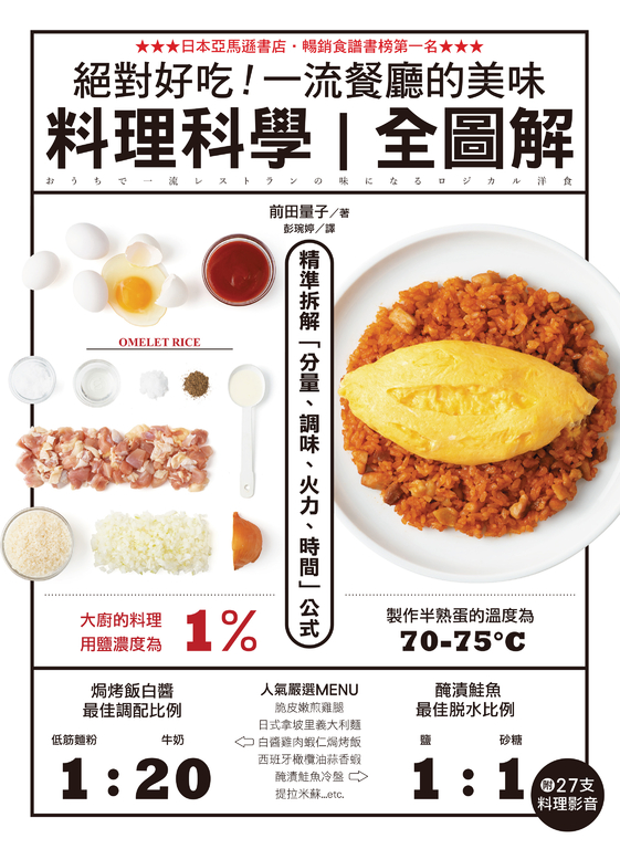 內容簡介 ★★日本亞馬遜書店․食譜暢銷書榜第一名★★料理新手說:「最近才對煮飯有興趣,而這本書大大提升了我的信心」廚房老手說:「說明簡單又仔細,了解食材烹煮的變化後口感升級了」「前田式」烹飪法的獨家步驟──「設定目標+美味公式」,將27道人氣「日式西洋料理」數據化,集結成任何人都能在家出好菜的「烹飪課本」! 不論是否有料理經驗的人,都常問我:「為什麼在餐廳吃的義大利麵可以兼具麵條口感又入味?」「為什麼在家煎雞腿排,容易半生不熟?」於是我想,寫一本可以輕鬆操作且不失敗的料理食譜,讓任何人都能了解美味的公式,只要照著做,就能成功! 我將白酒蛤蜊義大利麵、嫩煎牛排等人氣料理,以及白醬、紅醬等調醬,甚至是甜點提拉米蘇的製作都一一「數據化」,將每道料理先拆解出「三大美味目標」+「達成方式」並用「科學邏輯」的方式簡單說明食材烹調的變化,再精準提供調味、火侯和時間標準,組合出可直接應用的公式,更有「清晰大圖」和「料理影片」搭配參考,一本好理解、好參考且成功率超高料理課本,就此誕生啦! 本書特色 【特色1】將料理「邏輯數字化」!獨家研發「前田製法」讓你輕鬆搞懂美味的關鍵祕訣!你也是「加一點鹽」或「大概燜一下」的直覺型料理人嗎?如果你的菜不是「無滋無味」就是「太鹹太甜」,參考前田老師「設定美味目標」再從「火力、時間和分量」精準操作的料理法,搞懂成功祕訣就能道道美味! 【特色2】日式西洋料理完全收錄!從「歐姆蛋包飯」到「起司蛋糕」,人氣料理通通都有!不論是講究調醬比例的「肉醬義大利麵、奶油可樂餅」,還是注重溫度時間的「嫩煎豬排」和「西班牙海鮮燉飯」,甚至是「提拉米蘇、起司蛋糕」等高人氣餐點,全書一一清楚解析,讓你完美上桌! 【特色3】專家親自演示步驟過程!「實境大圖+料理影片」清楚解析,跟著做就能成功!道道俐落拆解成各步驟,且提供多張精美實境大圖,搭配獨家收錄前田老師27道料理影片,不需要再擔心「模糊的說明」臆測料理步驟,也不必聯想步驟之間的過程,不僅能更貼近成功核心,也絕對能完成料理!