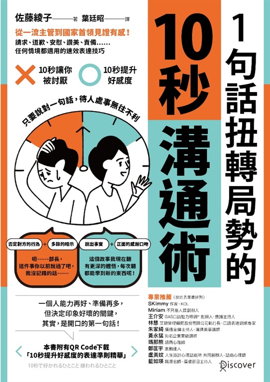 內容簡介 一個人能力再好、準備再多, 但決定印象好壞的關鍵, 其實,是開口的第一句話! 日本表達心理學權威、百萬暢銷作家 成功指導超過4萬名一流主管、56位國會議員, 就連日本前首相也是學員! ※本書附有QR Code下載「10秒提升好感度的表達準則精華」※ ►分秒必爭的時代,溝通更要快狠準 現代人工作忙碌,要處理各種大小事, 在時間有限的溝通時,與其長篇大論,不如精準表達, 除了高效省時,更可以讓人留下深刻印象。 ►一句話10秒鐘,決定被討厭或讓人青睞 擁有40年實務經驗的日本表達心理學權威佐藤綾子研究發現, 改變對一個人的好壞印象,不需要1週、1天、1小時、10分鐘…… 其實,關鍵只要10秒鐘! 她指出,就算一個人能力再好,如果沒有掌握短短的10秒鐘, 想說什麼就說什麼,很容易一開口就會後悔。 ►10秒最多44字,適用8大溝通目標╳59種情境,讓你無往不利 佐藤綾子提到,10秒鐘的一句話,最多能傳達約44個字(含標點符號), 只要有意識的練習善用,就能達到高品質溝通, 還能掌握對方心理,誘導情緒,進而得到青睞、逆轉局勢。 因此,她列出八大常見的溝通目標,包括:請求、提案、道歉、安慰、稱讚、責備…… 透過59種情境,提供「10秒讓你被討厭」和「10秒提升好感度」的圖解範例, 說明NG和OK說法,甚至提出肢體動作的好建議, 讓你了解溝通準則,就能言簡意賅,一句話就能快速達成目標: .提案時的情境:在會議中,提出創新想法 (╳)之前提案的內容有很多缺點。不過,我的提案剛好可以彌補這些缺點。 (○)我認為前人的心血很棒,在這個基礎上,我想多加一個新的提案,大家覺得如何呢? 【Bad Point】使用否定的說詞會招來反感 【Good Point】呼籲求新求變,並肯定過去 【肢體動作】再加入微笑和點頭,表達你的認同,對方就會採納你的意見 .難以啟齒的情境:下班前,被主管交代了很花時間的工作 (╳)不好意思,我沒辦法。今天已經下班了,我沒時間。 (○)這件工作確實很重要,我也很想馬上處理,但是我今天不太舒服,明天再處理好嗎? 【Bad Point】直接斷定你做不到,會給人不好的印象 【Good Point】肯定對方的提案,提供一部分的修正 【肢體動作】用眼神和語氣表達你的熱忱,同時露出疲態,婉轉拒絕上司 .道歉挽回雙方關係的情境:下屬應對不當,導致客戶有怨言 (╳)這樣喔……依我看,我們的員工應該不會做那種事啊…… (○)原來是我們員工的疏失,真的非常抱歉。 我馬上去確認狀況,到時候再與那名員工一起登門道歉。 【Bad Point】不要找藉口規避責任 【Good Point】先承認事實,表明下一步行動,以達到修正的效果 【肢體動作】用柔和的眼神接觸,表達你的歉意和後續應對方案 .激發對方拚勁的情境:和表現不錯的下屬搭話時 (╳)很厲害欸!你一個新來的可以做到這樣,真的讓我很驚訝。 (○)你工作這麼忙,也沒疏忽必要的準備工作,真的幫了我很大的忙。 【Bad Point】過低的評價只會破壞對方的拚勁 【Good Point】表達你的感激,藉此稱讚對方的本事 【肢體動作】表情和動作要盡量保持親和力 本書每種溝通情境都會搭配心理學準則、圖解和具體範例, 只要多加練習,任何情境都能舉一反三、隨機應變, 讓你一開口就能扭轉局勢、提升好感度,溝通任何事都無往不利,順利達標!