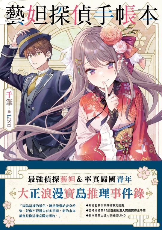 內容簡介 最強偵探藝妲&率真歸國青年大正浪漫寶島推理事件錄★知名犯罪作家既晴專文推薦★巴哈姆特第15屆遊戲動漫大賞銅賞得主千筆★日本商業出道人氣繪師LINO「因為這樣的景色,總是能帶給妾身希望,好像不管過去有多黑暗,新的未來都會是像這樣充滿光明的。」背負著嫌疑的留學生,回到了故鄉的南島,卻把自己的心,留在了遙遠的異鄉。在叔父舉辦的接風宴上,他遇見了神祕女子。長相稚嫩、大又水亮的雙眼,微笑時悄悄露出的虎牙,說話總是帶著優雅的語氣,她正是藝妲──水月。觥籌交錯間,水月突然語出驚人。「你在擔心海外留學時,認識的那個女人吧。」「想要和妾身談談的話,宴會之後就留下來吧。」這是否能幫助呂敬光解決一直縈繞於心頭的大石頭呢?還是從此成為記憶中的地縛靈呢?玩弄警察於股掌間的仕紳院怪盜、港町少女連續失蹤綁架案、選美藝閣遊行後臺凶殺現場……一拍即合(?)的偵探藝妲與助手青年搭檔,兩人能夠華麗地解決這些事件嗎?端上桌的謎團,請在冷掉之前,盡早享用!