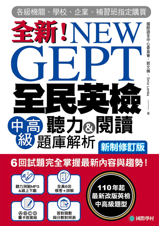 | 商品描述 | NEW GEPT 全新全民英檢中高級聽力&閱讀題庫解析【新制修訂版】(附音檔) (電子書):符合最新出題方式的6回聽力+閱讀模擬試題更新「聽力圖表題」、「整句填空題」、「雙篇 |