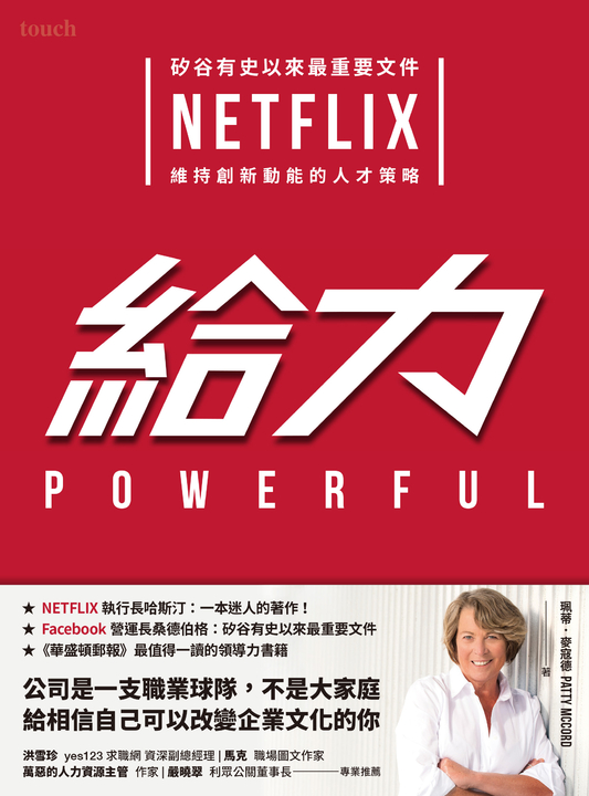 內容簡介 解密矽谷最重要的文件,造就Netflix成功的獨特用人心法在AI時代如何吸引、留住、管理人才顛覆你對工作與企業用人的思維成為未來需要的人才★《華盛頓郵報》最值得一讀的領導力書籍★Netflix執行長哈斯汀:一本迷人的著作!★Facebook營運長桑德伯格:矽谷有史以來最重要文件網飛文化集(Netflix Culture Deck)SlideShare點閱率超過 18,000,000 次這份100多頁的ppt文件,融會企業文化精髓,闡述Netflix重視的價值和人力管理方式。1997年,Netflix創立於美國加州,是一家小型地區DVD郵寄租片商;2010年,它擊潰當初市值大自己1,500倍的影音出租巨人百視達;2018年,公司市值超越娛樂龍頭迪士尼,終結HBO於艾美獎的贏家地位,乃至跟Google、Facebook、蘋果、亞馬遜等一線科技巨擘,平起平坐。20年來,Netflix如何變得如此強大?除開它慧眼獨具,轉型切入新世代需求的串流媒體服務、打造原創劇集《紙牌屋》《怪奇物語》、開拓全球市場190多國……之外,Netflix強就強在用人,與眾不同! 本書作者珮蒂.麥寇德說,多數公司在人才招募、激勵、及打造優異團隊方面都做錯了。麥寇德在Netflix擔任人才長有十四年,幫助該公司塑造出獨特的高效能文化,她協助創作的「網飛文化集」,重新定義了管人是怎麼一回事。Netflix主張一種自由與責任並重的新工作模式,把員工視為成熟的大人,強調絕對誠實,透明溝通。同時找到對的人上場,給出到位的業內最高薪資,以富有挑戰性的工作來激勵員工;而不符公司新需要的員工,奉上豐厚離職金,果決揮別。當公司是一支職業球隊來經營,不是大家庭。她以幽默輕鬆筆調,寫出個人經驗與心得建議,提供一條打造高績效文化和創造好業績的不同路徑,顛覆你對工作與企業用人的邏輯思維,刷新你的人才觀!在AI時代,不僅企業要發掘、聘用未來需要的人才,自己也要成為未來需要的人才,讓彼此持續締造佳績。各界名人、職場專家力薦,企業老闆、人資主管、廣大上班族都該一讀yes123求職網資深副總經理 洪雪珍/職場圖文作家 馬克 一本迷人的著作!帶你來一趟啟迪之旅,看看反傳統的年輕公司如何顛覆過去正統管理之道。──瑞德.哈斯汀(Reed Hastings),Netflix共同創辦人暨執行長 沒有天數上限的特休假、沒有績效獎金制度、不強調浮誇的辦公室福利設施、取消年度績效評量作業、鼓勵員工去其他公司面試……Netflix就靠這些嶄新的管理思維,打造高效能的團隊!──萬惡的人力資源主管,作家 這本書是給相信自己可以創造或改變公司文化的人。──嚴曉翠,利眾公關董事長珮蒂.麥寇德生動解說促使Netflix成功的公司文化,凡是想要事業在二十一世紀生存繁榮的人,都應該閱讀本書。麥寇德有渾然天成的說故事長才,她在本書中敘述的Netflix方法──絕對誠實、熱烈辯論、堅決聚焦於未來,這些都是可以幫助組織在二十一世紀勝出的管理實務。本書挑戰我們做出不同於傳統觀點的思考,也敘述許多深具啟發的故事,啟迪我們如何幫助自己及他人發揮最佳潛能。──雅莉安娜.赫芬頓(Arianna Huffington)《赫芬頓郵報》、健康管理新創公司Thrive Global創辦人麥寇德引據她建造高效能職業環境的數十年經驗,寫就本書,教你如何設計讓員工成功茁壯的工作環境。有志於發展和強化人才者將會發現,本書幫助你打造以相互尊重、同理心與創造力為基石的職場文化。──蘿琳.鮑威爾.賈伯斯(Laurene Powell Jobs,賈伯斯遺孀)公益組織愛默生基金會(Emerson Collective)創辦人兼總裁若你的公司追求卓越,並且自在於擁抱變革,本書是你必讀之作。麥寇德說出了許多領導人必須聽的話,並教你如何實行。──尼爾.布魯曼泰爾(Neil Blumenthal)與戴夫.吉爾寶(Dave Gilboa)Warby Parker共同創辦人暨共同執行長