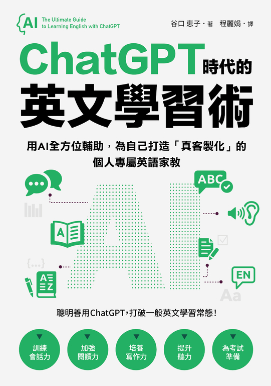 作者介紹 作者簡介谷口 恵子AI 應用之培訓教師、AI應用社群代表、英語學習之培訓教師、Petit Lettre 股份有限公司總代表、日本立教大學管理學部商業領導計畫講師2002 年畢業於日本東京大學法學部。於 2020 年完成東京大學跨學科資訊學府研究生課程。從2002年起,在日本甲骨文股份有限公司(美國Oracle Corporation在日本的子公司)擔任客服部門工程師,並負責 IR(對投資者的回應)。自 2008 年起,在Sony Corporation擔任採購部門的危機管理,以及針對交易對象公司的經營分析。2013年共同創立 Petit Lettre 股份有限公司,同時進行出版和諮詢業務,並擔任英語學習的教師,來協助社會人士學習英語。從 2023 年 2 月開始經營「AI 應用社群」(日本最大的AI應用社群,超過2萬人加入)。作為 AI 應用培訓教師,她致力於推廣在商業和英語學習中的AI應用。她的著作包括《3 個月打造英語耳的Shadowing跟讀法》和《一個月讀完外文書的英文閱讀》等(Petit Lettre)。譯者簡介程麗娟(Anisa chen)輔仁大學日文系畢業。從事日商祕書、口譯及翻譯工作近十年光景。目前為旅日譯者,同時也是線上日語教學機構專任講師,從事日語教學多年,擁有專業語文知識,擅長以淺顯易懂方式引導學生理解,並教導如何靈活應用。