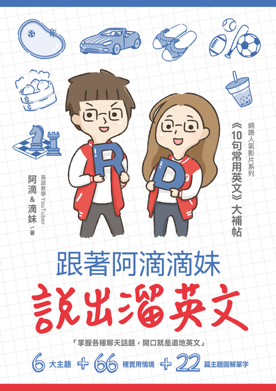 作者介紹 阿滴&滴妹 全台人氣第一名教學型YouTuber,獨一無二的兄妹檔!於2015年1月正式創立頻道,結合美國文化、新聞時事、流行音樂、創意教學等題材,製作好看又實用的教學影片,並在2017年7月達成百萬訂閱。在這個期間,透過影片觸及到了上百萬位學生、影片總觀看突破一億次!其中,《10個常用的英文句子》系列影片透過輕鬆易懂的句子帶出日常情境,讓人看一遍就可以講出一口溜英文。這本書則是這個長跑系列的擴充與延伸,讓你 #跟著阿滴滴妹說出溜英文!