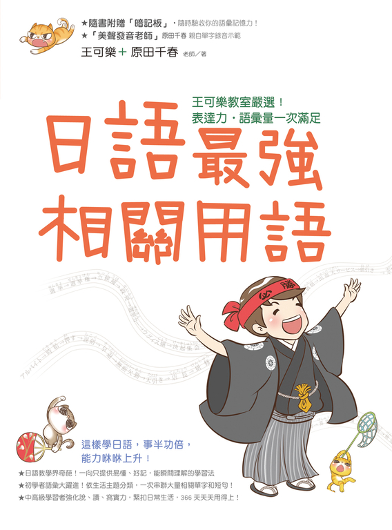 作者介紹 作者簡介王可樂 日本關西大學文學碩士,曾任職於「日本學術振興會」擔任「特別研究員(JSPS DC2)」。 2010年6月於日本大阪,以愛貓的名字創立「王可樂的日語教室」,專長是日本文學論和日本作家研究,著有多部論文。喜歡將複雜的東西簡單化,因此跳脫傳統模式,不斷地開發新的、有趣的日文教學方法。著有:《搞懂17個關鍵文法,日語大跳級!:跟著王可樂,打通學習任督二脈》《日語助詞王:王可樂妙解20個關鍵,日檢不失分(附贈「日檢模擬測驗練習本」) 》,2016及2017連續兩年榮登年度百大暢銷書。 王可樂日語教室粉絲頁 www.facebook.com 王可樂的日語教室-121678347864500 王可樂日語教室官網 colanekojp.com.tw 原田千春 1979年出生於日本兵庫縣。日本京都大學綜合人間學部畢業,工作八年後前往上海交通大學研習中文一年。2012年開始在王可樂的日語教室教日文,主授發音及聽力課程,更是眾學生公認的「美聲發音老師」。著有:《日語助詞王:王可樂妙解20個關鍵,日檢不失分(附贈「日檢模擬測驗練習本」) 》, 2017年榮登年度百大暢銷書。
