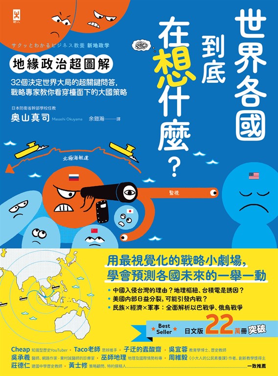 產品目錄 【前言】看穿國家表面下隱藏意圖的解讀技巧:如果國際政治是場「戲劇」,地緣政治學就是「舞台裝置」◆地緣政治學是……針對地理衝突頻繁三大區域,研究各國「一舉一動」的學問◆活用地緣政治學來制定戰略,就能藉由控制「道路」與「樞紐」,一口氣支配整個區域◆理解地緣政治學,就能看見世界的真實樣貌◆地緣政治學專欄(Geopolitics Column)01【第一章】認識地緣政治學的規則:地緣政治學的6大基本概念基本概念1:活用地緣政治學,就能掌控世界?基本概念2:掌控他國的「權力平衡」戰略,其實就是「猴子理論」基本概念3:扼住「咽喉點」,控制維持國家命脈的「要道」基本概念4:國際爭端中隱藏的「陸地強權」與「海洋強權」真面目基本概念5:大規模紛爭皆起自「心臟地帶」陸地強權與「邊緣地帶」海洋強權間的衝突基本概念6:國家衝突的潛在導火線?控制他國所必須之「據點」的重要性◆地緣政治學專欄(Geopolitics Column)02【第二章】認識能夠撼動世界的大國戰略:美國、俄羅斯、中國的地緣政治學▋認識美國地緣政治的特質Question 01 三大戰略地區 1 亞洲:面對急速成長的中國,美國有何計畫?Answer 01 美國謹慎守護世界霸權地位,出盡計策牽制對手Question 02 三大戰略地區 2 中東:美國與中東各國目前的關係究竟如何?Answer 02 美國因石油自給自足,曾退出中東,如今因宗教和民族問題再次涉入Question 03 三大戰略地區 3 歐洲:關鍵國家是烏克蘭、波蘭和中東的土耳其?Answer 03 烏克蘭、波蘭和土耳其位在俄羅斯擴張路線的最前線Question 04 霸權國烏雲罩頂!?美國即將發生內戰只是傳聞嗎?Answer04 目前的美國完全具備爆發內戰的條件!Question 05 決定美國未來路線的總統選舉。共和黨的川普和民主黨的拜登有何不同?Answer 05 川普奉行「美國第一」政策,拜登則注重穩健推動事務▋認識俄羅斯地緣政治的特質Question 06 看不見盡頭的紛爭……俄羅斯與烏克蘭的現況與未來走向如何?Answer 06 就像日本的北海道被占領一樣。俄烏互不讓步,未來可能演變成朝鮮半島的分裂狀態?Question 07 「北極海航道」的出現,如何影響俄羅斯和日本?Answer 07 「北極海航道」具備許多優點,卻因為俄羅斯入侵烏克蘭而中止啟用Question 08 與俄羅斯密切相關的要道中,除了「黑海、北極海航道」,其他4條要道現況如何?Answer 08 俄羅斯正在開發新的擴張要道,舊要道多數無法通行或狀況不明Question 09 普丁總統如何看待俄羅斯未來的地緣政治戰略?Answer 09 以地緣政治學建構戰略,目標是擴大影響力▋認識中國地緣政治的特質Question 10 為什麼中國直到今天,才開始向海洋擴張?Answer 10 中國開始能夠將軍力用於海外擴張,然而小規模衝突仍在持續中Question 11 明帝國以來的第二次嘗試!作為典型的「陸地國家」,中國如何向海洋擴張?Answer 11 在地緣政治學上,「第一、第二島鏈」是毫無道理的軍事戰略Question 12 中國與台灣的關係……街談巷議常常聽到「台灣有事」,實際上可能發生哪些事?Answer 12 若爆發軍事衝突將對中國不利!因此目前以讓台灣人倒戈中國為優先Question 13 有現代絲路之稱的「一帶一路」究竟是什麼?Answer 13 「一帶一路」目的是促進貿易,卻存在眾多問題,且正在萎縮Question 14 印度、東南亞群起反抗?!中國真的跟大河周邊各國爆發水資源爭端?Answer 14 河川下游國家可能面臨缺水問題!各國反對中國在上游興建水壩Question 15 中國國家主席習近平心中如何描繪中國的未來?Answer 15 最終目標是重建以中國為中心的帝國!◆地緣政治學專欄(Geopolitics Column)03◆地緣政治學專欄(Geopolitics Column)04【第三章】認識日本周邊國家的實際情勢:日本的地緣政治學▋認識日本地緣政治的特質Question 01 究竟為什麼俄羅斯不將南千島群島歸還給日本?Answer 01 「北極海航道」開通後,俄羅斯越來越不願意歸還南千島群島Question 02 對美國而言,沖繩美軍基地是「完美的據點」?Answer 02 沖繩美軍基地完美具備「據點」所需的全部關鍵元素Question 03 「世界警察」美國海軍的核心?美國海軍橫須賀基地擁有哪些「世界第一的裝備」?Answer 03 橫須賀基地擁有美軍縱橫天下必不可缺的巨型乾塢,能夠維修航空母艦Question 04 對馬列島、釣魚臺列嶼……探究諸多衝突的根源,「近海爭端」究竟是什麼?Answer 04 想要稱霸近海的中國勢力,與想要封鎖中國的美國勢力爆發衝突Question 05 除了嚇阻以外,美軍駐日對日本還有哪些意義?Answer 05 日本石油進口的運輸要道,幾乎完全仰賴美軍守衛Question 06 日本現階段還不需要擔心北韓飛彈?Answer 06 飛彈10分鐘就能飛抵國土,已構成莫大威脅,換作美國可能已空襲對方?◆地緣政治學專欄(Geopolitics Column)05【第四章】各種戰略錯綜複雜交織在一起:亞洲、中東、歐洲的地緣政治學▋認識亞洲地緣政治的特質Question 01 躲在中國背後飛速成長。近年來逐漸崛起的印度,如何與中國對立?Answer 01 對快速崛起的印度和中國而言,確保石油運輸要道是最重要的課題Question 02 東南亞各國:越南、寮國、柬埔寨、泰國,與美國、中國的關係究竟如何?Answer 02 東南亞必然要在美、中之間採取「平衡外交」戰略Question 03 明明只是小型都市國家,新加坡的成功是源自於地緣政治上的優勢?Answer 03 利用「位於亞洲中心」、「靠近麻六甲海峽」等優勢迅速發展▋認識中東地緣政治的特質Question 04 伊斯蘭國已經瓦解,敘利亞內