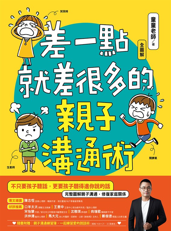 內容簡介 ──完整圖解親子溝通,修復家庭關係──今天的你又忍不住大吼了嗎?每天立志要當優雅雙親的你,把「溫和而堅定」貼在牆上的你,在崩潰前還在默念「不生氣心經」的你,在面對小孩聽不懂、講不通、秒崩潰的每個當下,你是戰──失聲大吼;還是逃—─假裝事情沒發生過,關係卻已經出現裂痕;或總在事發當下僵住,不知如何反應。我們都想好好說話,但面對孩子各種失序暴走,有沒有更好的方法,讓我們有機會聽進彼此的話?【關於溝通,我們都弄錯的事】 你的溝通,是為了讓孩子聽話,還是讓孩子聽得進去你說的話? 為什麼好聲好氣說話,但開口後衝突卻反而擴大? 到底是誰說用愛的教育,孩子就能自動被感化?溝通需要準備,也需要技巧,童童老師從腦科學、心理學、神經科學,整理出「讓你好好說,孩子好好聽」的五大溝通技巧,有練有保庇。• 給予選擇權──小孩才做選擇?YES!正確提供選擇權,讓你們一起找到前往目標的路徑。• 轉換肯定句──把「你不可以!」換成「請你這樣」。• 同理──學習刻意練習同理,接住孩子情緒。• 擴充彈性──從練習同理─堅持規則─提供替代選項中,讓孩子增加調節能力。• 順應邏輯──換個角度再來一次,找出解決方法,才能打開溝通死結。──那些年,雙親必踩的地雷話術,你中了幾個?── 你這是什麼態度? 再五分鐘喔! 沒寫完就不能玩玩具! 你可以專心一點嗎! 你就不能學姊姊嗎? 這麼簡單你都不會!避開NG語法,換個句型再來一次,每天一點點調整,就能帶來不同結果。即使努力溝通,但我們也知道不會馬上解決問題,親子溝通是每天每天的修行,所以需要每天每天的複習,因為我們想給孩子很多很多的愛,所以花很多很多的力氣,和孩子一起成長。──各界一致好評──「說話不是孩子擅長的事,卻是大人得刻意練習的事。爸媽如何說?說什麼?決定親子關係怎麼走。溝通不僅只是說,童童老師為你解惑。」──王意中|王意中心理治療所所長/臨床心理師------------------------------------「大人對孩子說的話到底是愛還是傷害?也許我們不一定能在開口前弄清楚吧?童童老師的新書用文圖並茂的方式,帶領我們跟孩子好好對話。」──尚瑞君|暢銷親子作家------------------------------------「快!快把童童老師的這本書買起來,翻開最容易踩雷的那區,看是要著色、寫提醒,還是畫螢光筆,貼在桌前、錢包裡、大門上,讓你馬上改運,改親子溝通的運。好的話語溝通模式:給予選擇權、轉換肯定句、同理、擴充彈性、順應邏輯,帶來思考模式改變、行動、習慣、性格,家裡氣氛、親子關係截然不同,在此誠摯推薦!」──林怡辰|閱讀推廣人/作家------------------------------------「童童老師的圖文說明,不但條理清晰,也具有說服力。以對話的方式呈現,也更能為家長解惑,幫助家長抓到重點,用更有效的方式進行親子溝通。」──洪仲清|臨床心理師------------------------------------「這就是我最想要的親子書:平易近人的原理、清楚可行的方法,更棒的是生動活潑的情境解析與圖畫說明。鼓勵父母人手一本,閱讀、實踐、體驗成效。」──馬大元|身心科醫師、四寶爸、公視《換爸媽》主持人------------------------------------「親子溝通不僅僅是言語的交流,更是親子心靈的連結關鍵。透過本書一起學習有溫度的溝通,共創親子關係的心有靈犀。」──鄭俊德|閱讀人社群主編---------------------------------------