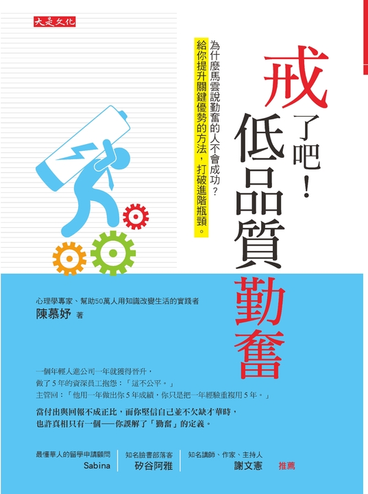 | 商品描述 | 戒了吧!低品質勤奮 (電子書):"一個年輕人進公司一年就獲得晉升,做了5年的資深員工抱怨:「這太不公平。」主管回:「他用一年時間做出你5年成績,你只是把一年的經驗重複 |