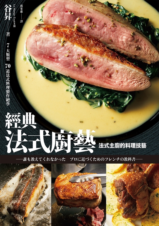 內容簡介 ~主廚40年功力真傳~7大類型、70道法式料理製作絕學,邁向專業之路的法式廚藝教科書。【本書特色】◎法式主廚40年功力真傳,7大類型、70道法式料理製作絕學,道道經典。◎相片詳實仔細,以文字剖析作法要訣,協助奠定法式廚藝基本功。◎在料理過程提醒「觀色、聽音、聞香、嚐味、觸感」,淬鍊法式料理奧義「驅使五感」。◆◆思索成品風貌,淬鍊「驅使五感」◆◆在烹煮料理的過程中,你是否曾思索品嚐者的感官,調整製作的環節:口食材經過燉煮後體積會縮小,所以食材要切成多大塊?口烤肉或烤魚往往都是先烘烤的那一面賣相較好,那該如何擺盤?口將蔬菜切成同等大小的用意是?上述種種思慮會直接影響盤中料理的呈現方式。對於一位精熟法式料理的廚師而言,「觀色、聽音、聞香、嚐味、觸感」這「驅使五感」是需要自然融入每道料理中的技藝。◆◆悉心傳授40年料理技藝以及判斷食材處理程度的重要指標◆◆本書的主廚谷昇,將在書中以最真摯的態度傳授40年的渾厚功力,細心解說法式料理的烹調訣竅與技術,以及每道料理背後蘊含的故事及料理精粹。✓撈浮沫的訣竅──是「靜待片刻」,耐心等待蛋白質凝固、湯液變澄清的那一刻到來。✓巨大聲響是油溫過高的證據;如果油鍋敲打著緩慢而不明顯的節奏,意即油溫過低。✓用鍋子乾煎伯方鹽讓水分蒸發,再使用網目較大的圓錐濾網過篩,此時用大拇指、食指、中指這三根手指抓起的鹽量就會剛好是1g的重量。每個細微的環節,都是歷經千錘百鍊歸納的心得成果。◆◆7大類型料理,從輕食、主菜~甜點,主廚料理奧義◆◆書中依照濃湯、沙拉、肉製品、肉類、海鮮、甜點等不同類型菜式進行系統編排,序章收錄了充滿活力與朝氣的法式日常料理,同時也會介紹適合用來當作「快餐輕食」的料理。【法式輕食】:歐姆蛋、洋蔥濃湯、法式起司鹹派……【濃湯】:鮮魚清湯、法式龍蝦濃湯、比利淡菜濃湯……【沙拉】:香烤白蘆筍、鮮蔬總匯、水果沙拉……【肉製品】:鮮菇香腸、法式子雞捲、法式兔肉凍派……【肉類】:烤全雞、雪莉醋燉牛肉、燴烤山豬肉……【海鮮】:法式龍蝦肉凍圓排、法式蒸鱈魚、蝸牛串炸……【甜點】:諾曼第可麗餅、巧克力慕斯、蒙布朗……法式料理是值得窮盡一生探究的道路,在7大類料理完成後,谷昇道出自己的廚藝哲學,包含「撒鹽的技巧」、「白醬的最後收尾」、「加入主要食材的高湯做搭配」每字每句都是真傳。