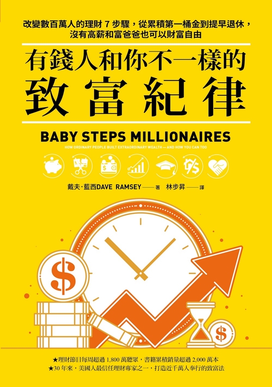 內容簡介 ◎理財節目每周超過1,800萬聽眾,書籍累積銷量超過2,000萬本 ◎30年來,美國人最信任理財專家之一,打造近千萬人奉行的致富法 越忙越窮、帳單永遠付不完?何時可進場?投資方法安全嗎? 不管過去財務狀況有多糟,沒有好學歷、好薪水、富爸爸,只要掌握本書的思維和策略,就可以擺脫月光族、青貧族、貸款債務,精準快速達標,從一無所有變身有錢人!◎翻轉數百萬人的財務困境,帶你打造0債務、富裕安穩退休的生活:— 萬名富人訪談,歸納大眾皆可仿效的生活方式、理財風格、日常習慣。— 設定短期和長期策略,培養專注心態,一次一小步,一次實現一個目標。— 不只脫債,更要穩健累積財富,列舉普通大眾的真實致富經歷。— 存足子女教育基金,教養子女成為理財高手。作者年輕時曾賺進千萬卻很快破產,重新學習管理金錢,以「嬰兒學步致富法」再度致富,這一套反覆測試與實證的理財法,過去30年來指導數百萬人管理金錢、儲蓄、投資,建立其夢寐以求的人生。◎有錢人都在做這些事,無須花俏理財花招,人人都可以實踐本書研究超過1萬名千萬富翁,分析富人特有的行為和心態,打破一般人對於有錢人的迷思,用數據證明最有效的致富之道。無論是沒有遺產可繼承的普通人、背負卡債和學貸的上班族、失婚且罹癌的單親媽媽、因財務問題鬧到快離婚的夫妻、起薪不高且40多歲才開始理財的工程師,都藉由作者提供的「嬰兒學步致富法」七大步驟,跨越財務障礙,安穩抵達致富終點。◎步驟1 準備緊急儲備基金:人生總有突發事件,只要活著就遲早會遇到壞事,需要有一把保護傘。 ◎步驟2 清償房貸之外的債務:最強大的財富累積工具就是本業收入,不再把錢拿去繳信用卡帳單、學貸和車貸,才會有閒錢投資。 ◎步驟3 建立充足的緊急儲備基金:運用於緊急手術、失業或汽車房屋維修等,避免又再次陷入債務困境。◎步驟4 長期投資:富人只是普通的投資人,固定每個月、每年或每十年進行投資,能承受短期波動,不會計算市場時機或聽信股市名嘴意見。◎步驟5 存妥兒女的學費:無法保證孩子必定會上大學或順利畢業,但自己一定會退休,在不犧牲退休金的前提下,不用學貸也可取得學位。 ◎步驟6 節省利息,盡早還清房貸:67% 富人在12年內還清貸款,只要有機會就多還一點,可節省高額利息。◎步驟7 過好沒有債務的人生。◎好評推薦雷浩斯|價值投資者/財經作家詹璇依|財經主播/財經作家林小印|整理鍊金術師很多人一定會想:做好財務規劃,會不會很困難?本書的「嬰兒學步致富法」,正是一開始就讓你像嬰兒一樣,一步一步打好基礎。你可能必須要忍受一些償還貸款的痛苦,以及延遲享樂,但是這些都會有回報,而且這個方式最大的優勢就是每個人都學得會,每個人都能做到,你不必是個天才,你也能夠學會這套方法。——價值投資者/ 財經作家 雷浩斯作者一步步教導理財小白成為平民千萬富翁,我很認同他的步驟跟理念。更重要的一件事,作者直接點醒大眾,真的不要以為自己開始理財之後就會成為巴菲特等富豪。我們可以透過理財,拿回人生的主導權。當你開始投資理財,如同嬰兒學步,步步向前、穩穩前進,最終將長大成為昂首闊步,有姿態、有生活、有財富的大人! ——財經主播 詹璇依◎超過2,000位亞馬遜讀者好評本書真的必須入手!書中有「一般人」就可以執行的明智理財行為和策略,各行各業都可以利用這套方法致富。雖然我最後還是有按照他的計畫,但先前嘗試了錯誤,學到不少慘痛教訓,假如我早點知道作者的策略,想必可以節省很多時間和精力。我已預先替孩子們買了好幾本起來,幫助他們在起跑點就有完善的致富計畫。本書涵蓋的理財資訊十分重要,務必要拿來幫助親朋好友。——亞馬遜讀者 皮取本書一針見血說明對許多人都有效的致富方法,以一則則真實故事為例,鼓勵讀者藉由小小的改變,時而如短程衝刺、時而如長程馬拉松,就有機會實現千萬富翁的目標。——亞馬遜讀者 奈森我在2017年狂聽作者的廣播節目,讓自己擺脫了月光族的生活,本書則是說明了一切的底層邏輯。作者行文簡潔明瞭、善於類比,透過故事來教導重要原則。身為擁有博士學位的讀者,我非常欣賞他們抱持嚴謹的態度,針對千萬富翁進行質化和量化研究。——亞馬遜讀者 施韋策