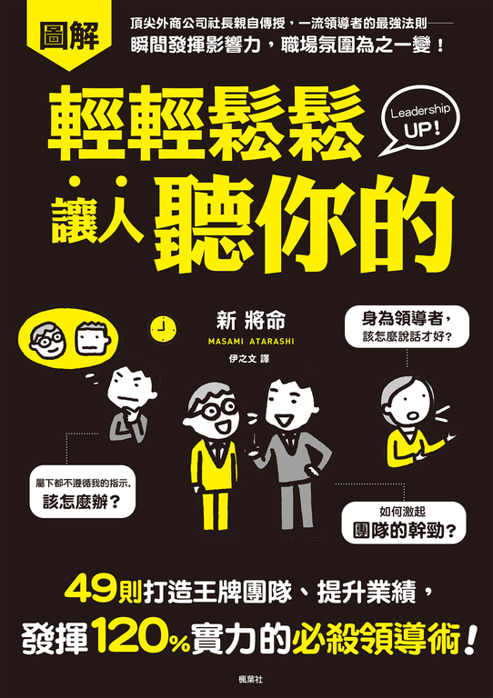 內容簡介 別人一開口就是金玉良言, 你一開口大家就頭腦放空嗎?‧「下屬都不聽我的,該怎麼辦?」 ‧「從前的上司變成自己的下屬,立場好尷尬!」 ‧「團隊沒有士氣,該如何激勵大家?」 頂尖外商公司社長親自傳授, 一流領導者的最強法則── 瞬間發揮影響力,讓職場氣氛為之一變! 在職場上,每個人都需要影響力, 想要同事聽你說話, 想要公司氣氛融洽, 想要溝通意見順暢, 想要團隊做出最佳成果, 你都需要「領導」的技術! 領導術不是只有領導者專擅的技能, 而是讓人願意追隨你、聽你說話的群眾魅力, 要如何點燃他人內心之火, 讓你的群眾魅力發揮到極致? 需要精準判斷情勢時── ▲有意識地運用「鳥眼」、「蟲眼」和「魚眼」來觀察 「鳥眼」從上空俯瞰全體狀況, 「蟲眼」從細節處觀察微小變化, 「魚眼」覺察公司環境、市場趨勢、社會動向。 若是無法準確的判斷狀況,就無法讓人心服口服。 多面向捕捉資訊,訓練第一時間的直覺力! 想維繫良好溝通品質時── ▲遵守「聽8說2」原則,做個稱職的傾聽者 扭轉上司說不停,下屬只能聽的慣性, 主動和下屬搭話,用「耳」+「目」+「心」, 構築心靈相通的關係! 團隊合作意興闌珊時── ▲靠「捲入大作戰」激起團隊幹勁,刺激大家的工作欲 關鍵在於「設定一個可接受的目標」, 討論公司理念,和團隊一起訂下目標和執行計畫, 巧妙地讓公司目標與員工目標「變得一致」, 就會產生「一定要達成」的決心! 讓別人自然而然追隨你── ▲光靠強大的工作能力還不夠,先從模仿「良好人格特質」的人開始 模仿「彼得‧杜拉克」、「戴爾‧卡內基」、「安岡正篤」等 這些具有良好人格特質的言行舉止, 塑造信用、信賴和權威的人格,自然會影響他人追隨! 10個激勵他人的原則+ 12個培育下屬的原則+ 8個提升業績的原則+ 9個克服逆境的原則+ 10個生出時間的原則+ =49則實用原則,發揮120%實力,讓人心甘情願聽你的! 本書特色 ◎49個即學即用的基本原則,來自六家跨國企業的頂尖社長實戰經驗傳授,用一半的時間將領導技修練至專業水準! ◎一頁解說+一頁圖解,將經驗淬鍊成圖表、數據和條列式解說,秒懂獨門經營法,大幅提升領導魅力!