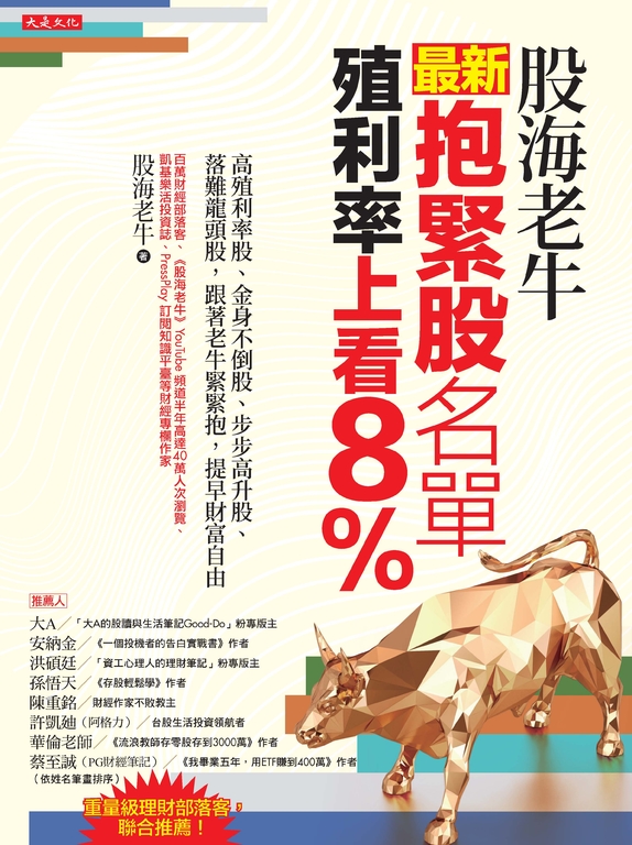 | 商品描述 | 股海老牛最新抱緊股名單,殖利率上看8%:高殖利率股、金身不倒股、步步高升股、落難龍頭股,跟著老牛緊緊抱,提早財富自由 (電子書):重量級理財部落客,聯合推薦!內附股 |
