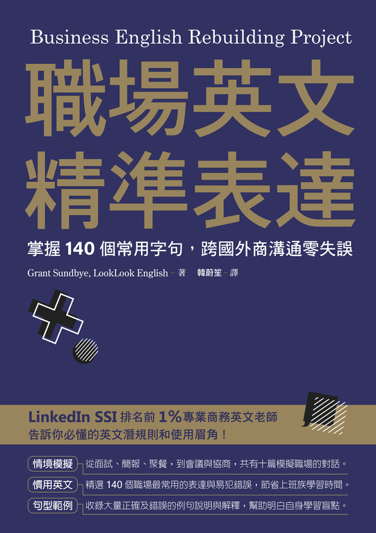 內容簡介 抄了一堆英文email模板,背了一堆商用句型,但是你真的完全了解這些句子背後的「英文潛規則」嗎?在LinkedIn的SSI排名前1%的專業商用英文老師Grant Sundbye,輔導過多名來自Samsung、LG、Google等大企業的韓國上班族,幫你整理出140多個在職場上最常使用、誤用的英文單字、文法,教你如何高語感、零失誤、精準表達!跨國外商工作者必備!你是否也有以下困擾?不緊急的事情也回 as soon as possible?和同事相約聚餐也說 appointment?超時工作到底是 overwork 還是 overtime?說了I understand well,卻只是和客戶雞同鴨講?不需要去學艱深的英文文法和高級單字,你只需要本書整理的國高中程度英文文法,再加上精準用字和一點點英文溝通禮節,你也能和外國客戶、主管高效談判溝通!本書特色【特色一】模擬實際職場的情境對話與例句書中共有十篇主題對話,從主角智媛在Chapter 1的面試到Chapter 10的海外商務會議,讓讀者學習時不再是死板地背誦例句,而是彷彿進入智媛的職場生活,跟著她一起學習到面試、簡報、聚餐、虛擬會議、客戶協商等實用的職場英文!【特色二】精選140個職場最常用的字句本書不從頭開始教詞性與文法,而是根據作者多年指導過上萬名韓國上班族英文的經驗,歸納出職場人士在溝通上最常犯的英文錯誤。不同於一般文法教科書,作者以幾行清晰明瞭的解釋,輔以大量例句和正反面範例,絕對是最節省上班族學習時間的英文自學書。【特色三】可相互對照的正確及錯誤英文句型範例本書於章節開頭會先給你一篇充滿錯誤的英文對話或示例,讀者可自行閱讀並找出錯誤處,作者會於章節末尾給出修正後的版本並標示出重點文法。每個小節文法中,作者會補充大量正確及錯誤例句,讓你不只能夠學習標準文法,更能從書中的錯誤處明白自身盲點,加深學習印象。例如:1.在回信的最後用「I’m waiting for your response.」做結尾,會給人有點無禮又生硬的感覺。錯誤用法:I’ll be waiting for your reply.正確用法:I look forward to hearing back from you! (formal) 期待收到你的回覆!2.appointment適合用於接待或交易等特定情況,不適合用於以友誼為目的,輕鬆見面的關係。如果是與某人輕鬆地見面,可以直接說出見面後要做的事(如 have coffee、have dinner 等),或是使用 hang out、meet up 等表達方式。錯誤用法:I’m really sorry, but I can’t attend our appointment tonight because my son is sick at home.正確用法:I’m really sorry, but I can’t have dinner with you all tonight because my son is sick at home. 真的很抱歉,我兒子生病在家,所以我今天沒辦法跟大家一起吃晩餐了。【特色四】部分單字英英釋義,對話可中英對照學習本書部分單字會提供英英釋義,可補充單字轉譯後容易讓非英文文母語者混淆的部分。對話及文章皆有中英對照,易於讀者閱讀學習。專業推薦Chloe Park|三星電子,資深UI設計師Jin Hyeonjeong|百靈佳殷格翰(Boehringer Ingelheim),通路行銷經理Chelsea 英文喬起來|商務英文Clare|商英訓練講師(兼教材創作者)Jen 林俐吟|Jen Academy 創辦人、企業英文講師Lu│頂尖英文教練——好評推薦「由於計劃要移居美國,所以我想準備英文面試。在課堂上,我的英文履歷經過多次修正,並能用更有條理的回答來應付面試。……課後我還收到了幫我糾正口語與文法錯誤的回饋筆記。我敢說在我見過的英文老師中,Grant是最棒的。我強烈推薦。」—Chloe Park|三星電子,資深UI設計師「能遇到Grant真是太幸運了!我在跨國企業工作了好幾年,還是對英文相當沒有自信。透過Grant的課程,才讓我掌握了自己常犯的錯誤,並且能逐漸改善這些錯誤。」—Jin Hyeonjeong|百靈佳殷格翰(Boehringer Ingelheim),通路行銷經理「在線上教商用英文的這幾年,發現學生常把以前學校考英文的模式,誤認為你需要的職場英文,連帶沒了開口的勇氣。英文要像新聞稿一樣華麗?No no!日常商用英文實用最重要。這本書給了很多可以即看即用的好例句,從日常辦公室溝通、會議討論、電子郵件等,本書的內容都會讓你有『喔~原來這樣講就可以了!』背單字就是要中英對照?本書有許多常見的誤用解說很值得細讀,因為我們都愛用中文解釋背單字,所以有很多中文母語者很常誤用的混淆字,書中都有清楚解釋,加上工作情境的例句幫你更了解。」—Chelsea 英文喬起來|商務英文「成功商業人強調:魔鬼就在細節裡。這也適用於英語文應用。不少人在說寫時堪稱流利,實經不起細敲。文法性錯誤,在乍聽乍看下不要緊,可累積多了後,會讓國際夥伴覺得不自然(卻出於禮貌不糾正)。無形中便會削弱己方的可信賴指數。本書把亞洲學習者在說寫英語文時常出現的問題,以筆記型態做解說和糾正,必能有效協助中上程度者精益求精。」—Clare|商英訓練講師(兼教材創作者)