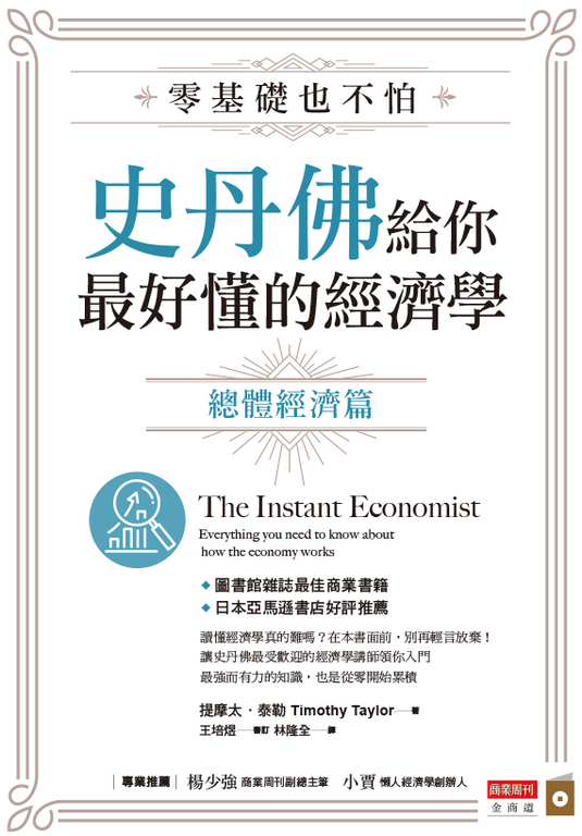 內容簡介 " ★史丹佛大學經濟學課程人氣講師著作★ 經濟學是你一生受用的隨身常識 要懂經濟學,讀這本就夠! 為什麼要懂經濟學?因為你會知道自己賺的是什麼, 知道怎麼看對趨勢、累積財富、理解世界。 本書作者是史丹佛大學最具人氣的經濟學講師,曾獲大學學生評鑑的教學成果獎,足證課程內容充實、相當具有吸引力。 他所撰寫的經濟學讀起來毫無負擔,讀者甚至能一點就通;從生活實例引入觀念原理,概念清晰,一般大眾都能輕鬆理解。 經濟學是「思考問題」的架構。 我們毋須具備專業資格,靠「社會大學文憑」也可以堅持自己的看法,只要你懂得像經濟學家般思考就夠了。 在總體經濟篇,你可以理解下列觀點 : ◆你的國家富有嗎? 國家經濟成長是影響我們生活水準的唯一關鍵。你知道衡量國家經濟規模的GDP怎麼計算的嗎?數據又如何解讀? ◆你什麼時候會失業? 經濟學家把失業分成:自然失業和循環性失業,兩者有何不同?勞動需求為什麼與景氣、通膨有高度關聯?凱因斯學派和新古典經濟學派又在爭什麼? ◆金融風暴前有什麼徵兆? 遭遇金融危機的國家有哪些共通點?國家財政緊縮、無力償債,外資與匯率的波動又如何造成全面性的金融崩壞,經濟學家們如何應變、真有預防之道嗎? ◆貿易大戰誰是贏家? 美國老大一句話,全球市場皮皮挫。保護主義大行其道,經濟成長真有必要互相傷害?貿易戰將使全球經濟陷入癱瘓嗎?誰又是笑到最後真正的贏家?本書特色 ◎從微觀到宏觀:從認識個體經濟學開始,循序漸進將目光拓展到到宏觀的總體經濟。本書能帶讀者們領略個人資產與市場、世界經濟的相對關係。 ◎份量充足的知識:本書不賣弄艱澀的理論,易讀、好消化,讓一般人望而生畏的經濟學,變得親近可理解,知其然也知其所以然。 ◎緊扣時事及財經議題:重大經濟議題如同歷史輪迴一般,不斷重演。本書「說故事」般的行文節奏,能為你分析事情的前因後果。即使歷史重演,你也不會重蹈覆轍,做出錯誤的決定。得獎紀錄 ◆日本亞馬遜書店好評推薦 ◆圖書館雜誌年度最佳商業書名人推薦 專業審訂:王培煜 專業推薦:楊少強(商業周刊副總主筆)、小賈(懶人經濟學創辦人)"