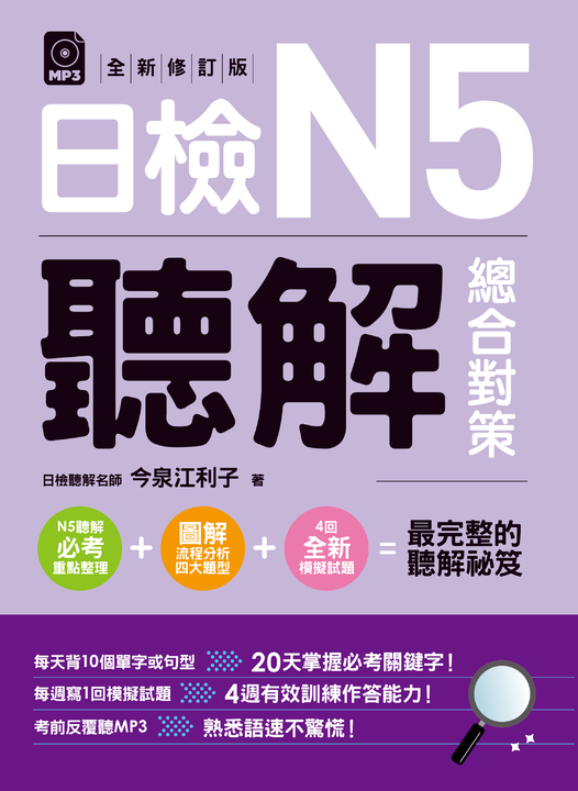 內容簡介 這本N5聽解書最完整! 《日檢N5聽解總合對策》好評不間斷! 全新修訂改版再進化登場! 撰寫聽解書10年以上經驗的日籍名師,口碑保證! 本書獨家「N5必考重點整理」x「3+1回模擬試題」x「90天讀書計劃」 「全方位學習」幫助讀者日檢N5一發合格!本書特色 特色一:全新編寫「讀者最容易錯、最常錯」的模擬試題! 原來以下例題的「つまらない」不是「無聊」的意思?! 男:これ、つまらないものですが。(這個,不成敬意的小東西。) 女:そうですね。大丈夫ですよ。(嗯。沒關係喔。) ──不能這麼回答! 「そうですね」表示認同對方的說法,沒有正確回答到話題。 女:どうもすみません。(真是謝謝你。) ──這個回答才正確! 「どうもすみません」表達讓對方費心而感到不好意思的心情,或表達出自己感謝的心意。 特色二:考前90天,N5必考重點全都在整理在一起! 藉由觀察歷年日檢出題方向,並因應日檢題型逐年變靈活的趨勢, Part1部份老師整理出N5必考「80個單字」、「16組文法」、「24句慣用語」以及「口語表現」,讓讀者事半功倍地學習。 特色三:考前60天,先聽再讀做筆記!教你答題技巧 Part 2針對四大題型,使用一目了然的「圖解」告訴讀者聽重點的順序。 問題1 課題理解:分辨「需要與不需要做的事」「已完成或尚未完成的事」「事情的優先順序」。 問題2 重點理解:仔細聽談話內容,找出「主語」和「疑問詞」。 問題3 發話表現:看圖並聽狀況說明,注意發話者應如何「發話」。 問題4 即時應答:從生活化的簡短對話裡,做出最合適的「回應」。 特色四:考前30天,準備天數太少!「MP3」是快速有效學習吸收的秘密武器! 每週做1回模擬試題,對照雙欄設計的中日文詳解,檢討問題更迅速。 全新錄製的MP3:反覆練習聽,讓讀者對日文母語人士的說話腔調和速度耳熟能詳。 聽一次發現聽不懂……反覆多聽幾次直到聽懂為止! 聽好幾次還是不懂……翻到詳解參閱重點解說分析,輕鬆理解問題!各界推薦(按姓氏筆畫順序) 王世和 東吳大學日本語文學系教授 方献洲 中國文化大學日本語文學系專任副教授兼系主任 都築徹 PERSOLTAIWAN(台灣英創管理顧問股份有限公司)董事總經理 蘇克保 東吳大學日本語文學系副教授兼系主任各界好評 王敬翔 國立聯合大學語文中心助理教授日文教師 1. 生活化、實用化:對考試中常見的語彙及句型有極為詳盡的整理,且貼近日本人的日常生活用語情境。本書希望對學習者而言並不僅是準備考試,更有助於提昇整體日語應用能力,一舉數得! 2. 詳加整理解題流程,清晰易懂,針對各題重點與學習者易錯的部份加以解析,有助克服聽力上的弱點,增進實際日語程度。 3. 清晰的品詞分類與慣用句整理,易記易懂,必能幫助學習者提昇整體日文程度,合格大丈夫! 知惠塾語文工作室 《日檢聽解總合對策》一書,不只提供日檢聽力的解題技巧,並詳細介紹整理了容易使考生混淆的文末表現(例如雖然是否定形式但其實是肯定語氣),與口語中常見的縮約形和慣用表現等。不僅推薦給因為日檢聽力而感到不安的人,對於感到自己學了很多文法、背了很多單字,卻還是因為聽力而感到挫折的學習者而言,也是非常實用的一本聽力攻略與練習書。 劉月菊 國立台北商業大學商業設計管理系日語講師 日檢聽解CD一經播放,過程緊湊且無法暫停,如果沒有做好萬全的準備,很難合格。然而,身處中文環境的學習者,面對市面琳琅滿目的聽解書籍,該如何選擇才能得到最佳的學習效果呢?推薦你這本獨家專為在台日語學習者量身打造的日語聽解訓練的好書,內容讓你宛如置身日本社會的日常情境,專業、易懂、生活化,句句都是日檢所標榜的重點考試方向。只要隨著書中規劃的90天完美讀書計劃進行,就能理解聽力的技巧精髓,讓N5聽解輕鬆過關!