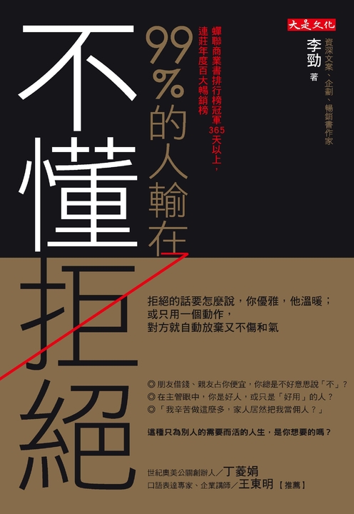 | 商品描述 | 99%的人輸在不懂拒絕 (電子書):"當你把付出變成習慣,以為被人利用也算是一種價值,你會在不斷的接受和服從當中,失去自信、丟掉自尊,只為別人的需要而活。這是你想要的 |