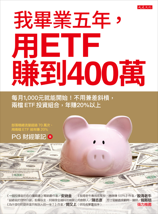 作者介紹 "PG財經筆記 中央警察大學畢業,曾任刑事單位偵查人員、派出所所長。 大學時買過郵政6年期儲蓄險,畢業後開始投資股票。在閱讀伯頓‧墨基爾的著作《漫步華爾街》後,如獲至寶,最終選擇以被動投資、指數化投資、資產配置為自身的投資核心宗旨,目前ETF投資組合年化報酬率為8.28%。 2016年開始經營部落格「PG財經筆記」,記錄投資心得,擅長以深入簡出的筆調及理性思維,來探討關於理財的大小事,網站總流量超過70萬次。文章被廣發並轉載於《中國信託證券》、《經濟日報》、「商周財富網」、「風傳媒」、《Smart智富月刊》等媒體。現正準備CFP國際認證高級理財規劃顧問(Certified Financial Planner)考試。"