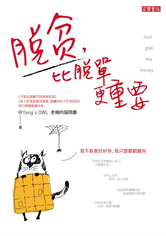 內容簡介 你來人間走一趟,不是為了出洋相體面的生活,一定與錢有關任性的前提是強壯的二頭肌和肥滿存款你已經身處這個功利的世界了,說沒有慾望肯定是假的。你說你拒絕做貧困世代,想做斜槓青年,想要爽當Youtuber,成為HowHow那樣優秀又能賺大錢的人,可以。但你實現得了嗎?更重要的是,你打算如何來實現?暢銷書《不要在該奮鬥時選擇安逸》作者――老楊的貓頭鷹再一次寫給廣大年輕世代的「醒腦之書」!直擊功利世界的真實故事,教你認清「金錢」和「顏值」這兩者在現實社會中的定義。同時也拆穿你的焦慮、迷惘、不安、孤獨,是自我情緒勒索,還有你經常缺錢、缺愛、缺顏值的自怨自艾,實際上是你努力不夠、缺乏自律、沒有堅持。老楊的貓頭鷹說:「做人要有底氣,少些戾氣。我沒辦法給你摸摸頭安慰你,我只負責溫柔地打醒你!願你在讀完這本書之後的人生特別有錢,特別走跳,也特別威猛!」你經常看不慣自己,卻也拿自己沒辦法。曾經的心願是「發財致富」,後來只想要「早日脫貧」;白天你兢兢業業;晚上你又繼續熬夜。你的生活常態是:心很大,但,餘額不足。你朋友說「人生苦短就要買買買」,卻沒人提醒你信用卡刷了是誰來還!好多人都在高呼「來一場說走就走的旅行」,但沒有人點醒你,說走就走之後的吃土生活是誰要過?你有被討厭的勇氣,也有敢於做自己的勇氣,但成就自己高遠目標的資本,你攢夠了沒有?你說好吧我乾脆無欲無求,反正貧窮對你來說,不過是晚餐吃牛排和吃饅頭的區別。可是當你碰到昔日老友成為今日的菁英,或在工作中遇到強勁對手而痛失良機時,你就會深深感受到之前「甘於小確幸所以沒上進」帶來的自卑和打擊。世界就是這樣殘酷:你窮,壞事就逆流成河;你弱,壞人就漫山遍野。所以必須狠狠地告訴你:能用汗水搞定的事情,就不要用淚水!人生意義,不要指望旅遊景點中找到!體面的生活,一定與錢有關!任性的前提是強壯的二頭肌和肥滿存款!一個人窮慣了,就會有戾氣,會失去理智;一個人窮久了,就會失去生活的雄心,就會丟掉氣質,然後只剩下滿滿的怨氣、苟且和各種小鼻子小眼睛的省錢招數。所以,請你一定要置頂賺錢的能力!唯有這樣,你才養得起自己那個愛吃的胃,貪玩的心,和愛買的手。讓自己有錢,就像是擁有一張VIP卡,將你的生活從「困苦」模式切換成「好爽」模式。
