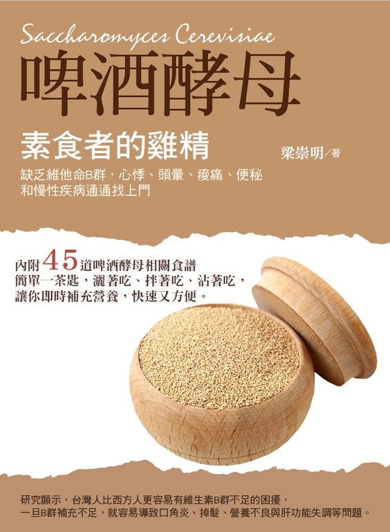 內容簡介 在台灣,大約有60%的人維生素B群攝取不足,它是身體的基石,一旦攝取不足就容易有生長遲緩、掉髮、感冒、營養不良等問題,若嚴重缺乏時可能造成肝功能失調、頭暈、心悸、痠痛與便秘等疾病,影響身體機能的正常運作。被稱為素食者的雞精——「啤酒酵母」,不僅含有絕佳的蛋白質、完整維生素B群與多種礦物質,且幾乎不含脂肪、澱粉和糖,能促進新陳代謝,增進食慾、維持健康與活力,是最適合素食者的植物性蛋白補充品。啤酒酵母的主要功能除了養顏美容、增強活力外,還能有效調整胃腸及肝臟機能,對糖尿病、肝病、貧血、皮膚病、痔瘡、攝護腺腫脹患者助益良多。根據研究顯示,啤酒酵母可以提升癌症患者的免疫力,增強抵抗力。歐、美和日本專家也已證實,啤酒酵母具有抑制肝癌、膀胱癌的作用。但啤酒酵母一旦超過75℃,營養就會流失,一般都是建議直接加入優酪乳或豆漿中,我們這次特別與春天素食餐廳合作,以健康、天然與保留全部營養為主要訴求,設計出50道精緻的啤酒酵母食譜,讓大家能輕鬆用啤酒酵母入菜,從日常料理中補充身體必要但缺乏的營養成分。