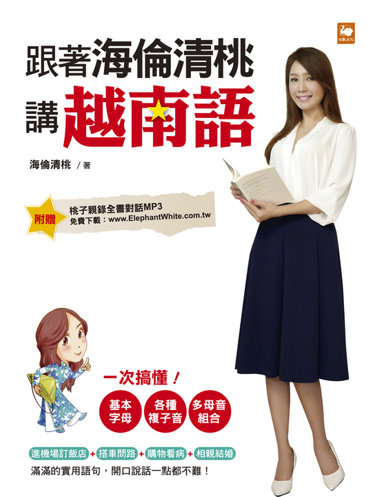 內容簡介 ◎全書共13篇,從基本字母、發音介紹到與生活、工作相關的滿滿實用語句,循序漸進學習,原來開口說越南語一點都不難!◎情境式會話配合生動的桃子寫真照,不論是越南經商、拜會客戶、工作協調、旅行問路、交友相親,甚至與越南籍幫傭看護溝通都很受用。◎附贈桃子親錄全書對話MP3,白象文化官網立即免費下載:www.ElephantWhite.com.tw以「台灣人思維所編寫的越南語工具書」:精彩的插圖、有系統的分類、溫馨的編排、自在的學習、深入淺出的介紹如何以南越語找到所要的事物,能在實際生活上能發揮作用,讓原本沒想要學越南語的讀者,也情不自禁流連忘返。越南語一本就通!繼第一本感性寫真書《海倫清桃:坦然做自己》之後,《跟著海倫清桃講越南語》讓讀者看見知性的桃子……來台發展多年,努力成為「真正台灣人」的藝人──海倫清桃,除了立志成為國際性演員之外,也十分關注國際動向和台灣社會的需求。桃子明白台灣擁有二十萬左右的東南亞新住民,及其約五十萬的第二代,而他們正是台灣扎根東南亞的種子,於是因著市場的需求,著手「以台灣人的思維」來編寫這本「越南語工具書」;希望透過自己學習中文時所累積的經驗,同時站在學習者的角度,出版一本能讓大家快速理解,輕鬆學會簡單越南語的實用書籍,期能對大家到越南經商、旅遊、探親甚至就業多所助益。因應政府的「新南向政策」──加強與東南亞各國之間的經貿發展,而擁有該國語言的人才就成了立足東南亞的灘頭堡。桃子在這本書裡面特別加上了「桃子小叮嚀」,例如:越南沒有星期一,台灣人認知的星期一其實是越南的星期二,這樣的文化差異常會造成外國人和越南人在約定時間上的認知錯誤,所以和越南人敲定時間(包括診病時間)時最好再以西洋日期做確認哦!相信更能增加讀者對當地文化、生活習慣等等的認識。【註】白象文化官網提供「桃子親錄MP3」下載,唯少數錄音之「中文」與書稿稍有出入,但不影響字義,請讀者聽讀時以書籍內容為主。