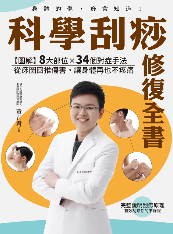 內容簡介 【電子書加值版】獨家影片﹕刮除你的不舒服──下半身水腫──身體的傷,痧會知道──第一本以「科學實證」解析刮痧的全方位書籍!從中暑、感冒、睡不好到落枕,放鬆肌肉、緩解壓力的自癒手法。袓傳三代刮痧&MGA筋鑑康創辦人黃卉君,帶你從中西醫角度,一探刮痧的奧祕!很多人以為只有中暑才刮痧,事實上只要不舒服,都能透過刮痧來緩解。身為祖傳刮痧的第三代子孫,作者黃卉君從小被刮到大,包括身體不適、壓力大,甚至是失戀傷心時,都會透過刮痧來改善。不過,許多人常不明白刮痧原理,也不懂該怎麼刮,黃卉君遂決定以自身所學,結合解剖及物理治療專業,並查證大量刮痧文獻資料,再搭配袓傳刮痧經驗,用最科學的方式、最簡單的道理,來傳承刮痧文化。這是一本適合所有人的科學刮痧書,書中將告訴你:▍什麼是「刮痧」?你是否以為只要用力刮拭皮膚,出現紅紅的就是刮痧?事實上,在MGA系統裡,透過正確的器具(刮痧盤)及介質(刮痧油),慢慢刮拭身體,進而讓「痧」浮現,才是真正的刮痧。▍透過刮出來的「痧」,找到身體的疼痛!透過正確方式刮痧,刮出來的痧會具有鑑別度,又稱為「痧圖」,我們就能透過痧圖來辨別痧的種類,並看出傷痛的新舊程度,甚至回推當事人的生活習慣,如此一來就能知道該如何保養身體。▍圖解34個對症刮痧手法,改善疼痛,提升自癒力!書中收錄常見刮痧手法,皆搭配清楚照片及步驟,不論是幫對方刮或自己刮都適合。像是:【症狀1】睡不好──刮頸脖及肩膀 【症狀2】便祕──刮兩側腰部【症狀3】鼻塞──刮鼻竇處【症狀4】中暑──刮前胸及後背透過卉君老師的解說,你將完整了解刮痧原理及手法,有效刮除身體的不舒服!▍精彩內容搶先看 ▍1.學會選擇適合的器具,刮出具有「鑑別度」的痧。2.教你辨別刮出來的痧圖,分析當事人的症狀。3.了解刮痧的手法及握盤法,有效透過刮痧放鬆。4.從肌肉解剖學來理解刮痧的部位,才能精準下手。5.運氣不好也能透過刮痧改善?寵物也適合刮痧?最想知道的問題,一次解答。國內名家一致推薦Hunter∣動知物理治療所院長、物理治療師Joeman∣百萬YouTuber王子娟︱台灣物理治療學會理事長、陽明交通大學物理治療暨輔助科技學系教授林嘉俐∣演員林明樟(MJ)∣連續創業家暨兩岸三地上市公司指名度最高的頂尖財報職業講師郭純恩︱里約及東京奧運隨隊中西醫師陳譽仁∣輔仁大學體育系專任助理教授莊佳佳∣ 2016里約奧運跆拳道選手簡少年∣命理專家(依姓氏筆劃排列)好評推薦與卉君老師合作幾次後漸漸地了解到刮痧科學的一面,以往許多人都會認為刮痧只是皮下出血如同瘀青一般,但實際上並非如此。看完這本書大家可以更了解刮痧科學的一面,同時也能學習基本的刮痧技巧,在家也能做好身體的保養,非常適合做為自我保養的工具書。──Hunter,動知物理治療所院長、物理治療師我嘗試過許多放鬆身體的方式,但科學刮痧對我來說,絕對是一種更深層且更持久的舒緩手法。也因為卉君的關係,打破我對刮痧就是要刮到痛徹心扉的傳統印象,讓我明白原來刮痧不只是民俗療法,其實也可以很科學!──Joeman,百萬YouTuber我誠摯地推薦這本《科學刮痧修復全書》,它將為您帶來全新的視角,並能深入了解健康。無論您是對刮痧有興趣,或是渴望改善自己的健康狀態,這本書都將是您不可或缺的寶典。──王子娟,台灣物理治療學會理事長、陽明交通大學物理治療暨輔助科技學系教授因為節目訪問了準博士卉君,才明白刮痧原來可以「很科學」!正確的刮痧不是用蠻力將患部的微血管刮破,而是透過刮痧讓痧自動浮現,也就是痧圖。透過痧圖的分布與深淺,療癒身體,更療癒心靈。所有的撇步都在這本書裡囉,感恩卉君老師!──林嘉俐,演員很高興看到卉君博士把華人的刮痧療法用科學的方式介紹給大家,讓我們可以一起用正確的刮痧知識保養自己的身體。──林明樟(MJ),連續創業家暨兩岸三地上市公司指名度最高的頂尖財報職業講師將古籍對刮痧之記載,應用到實例,並加以系統化,與現代理論結合,幫助運動員恢復、提升運動傷害治療底蘊。──郭純恩,里約及東京奧運隨隊中西醫師這是一本不僅圖文並茂,解釋清楚與不斷探討實證與背後可能機轉的臨床工具書,也是將刮痧從器皿、介質、評估到執行手法都演繹清楚的一本好書。我很榮幸能夠推薦給身為讀者的您,希望您也能感受到卉君熱情努力的能量。──陳譽仁,輔仁大學體育系專任助理教授「痧」可以讓你認識自己的身體,成為更好的自己。──莊佳佳,2016里約奧運跆拳道選手黃老師的專業無庸置疑,我自己也有跟她學習刮痧,現在在家也會幫家人刮,希望大家也能喜歡這本書。──簡少年,命理專家