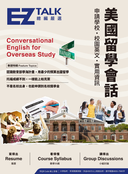 內容簡介 給準備出國留學的你!嚴選美國留學生一定要用的生活對話從申請學校、選課、看懂課程大綱,到考試拿高分訣竅,讓你在校園內暢通無礙! 涵蓋托福╳雅思常考的校園相關單字與對話 去歐美留學的你一定要會! 柏克萊大學YouTuber WaWa TV Lisa撰寫實用資訊 本書特色 特色1 提供申請資料範本與教學,辦理美國留學,你可以不用找留學顧問 提供履歷 (resume)、讀書計畫 (statement of purpose)、簡短問題、長篇文章撰寫範本與寫作重點,靠這本就能掌握回答技巧。 特色 2 每個單元皆搭配「實用資訊」,一目了然最清楚 各主題先介紹相關的實用資訊,像是「申請美國學生簽證」這篇就先告訴讀者申請流程、學生簽證種類、簽證面談程序與答題技巧。先對申請簽證這件事有個大方向的認知,接下去看相關好用句和面試對話才夠清楚。讀完整本,包你就像美國學生一般如魚得水! 特色3 真實海外校園場景對話+好用句,滿足各種需求 針對海外校園生活所想得到的各種需求,收錄最派得上用場的對話,獨家「Common Phrases好用句」讓你遇到狀況隨學隨用!如「詢問註冊問題,你要會說」、「在課堂發言,你要會說」、「詢問學生證可享優惠,你要會說」、「和室友溝通,你要會說」。 特色4 圖解英文、閱讀測驗、聽力測驗,幫你輕鬆理解看不懂或聽不懂的校園英文 有時候難以理解的不只是對話,各類圖表和密密麻麻的英文也讓人心生畏懼,或是教授連珠炮似的課程大綱說明。別擔心,我們都想到了,書中有實境照片圖解並加以解說,如「醫療保險方案」、「學校餐點方案」、「課程大綱」、「租屋廣告」等,許多圖表還搭配測驗題,考考你是否真能看懂。 特色5 專家撰寫主題相關專欄,讓你對海外留學有更清楚、全面的認識 想知道更多留學與遊學資訊,但英文沒那麼好,也不確定自己是否該出國。沒關係,看完各領域專家的介紹與分析,也許你會更清楚自己想要什麼。 特色6 編輯團隊多具美國留學背景,對話和實用資訊皆為最在地、最正確 撰稿者與實用資訊撰寫者皆有美國留學背景,編輯也有國外留學經驗,確保提供的對話場景與實用資訊的實用性、在地性與正確性。