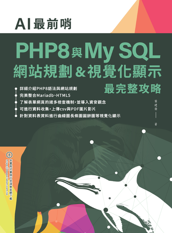 商品描述 | AI最前哨:PHP8與My SQL— 網站規劃&視覺化顯示最完整攻略 (電子書):●詳細介紹PHP8語法與網站規劃●完美整合Mariadb、HTML5●了解表單網頁的諸多檢查機制,並導入資安觀 |
