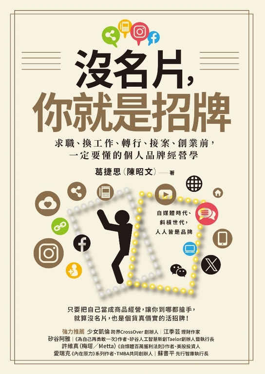內容簡介 自媒體時代、斜槓世代,人人皆是品牌,不過,現在越來越多人工作做不好也無所謂,以為換了職場,就能重新做人,但其實,一個人的評價會口耳相傳,很難洗白,只要把自己當成商品經營,讓你到哪都搶手,就算沒名片,也是個貨真價實的活招牌! ► 不只斜槓,更要跨能:設計出身,跨足行銷、管理人、HR《市場買單,你才叫品牌》作者葛捷思,原本的在學背景是商業設計科系, 他一路從設計到行銷市場,再跨領域到營運管理, 十多年的行銷市場與營運管理的資歷, 操作過許多的品牌企劃,以及政府與科技園區的專案執行設計計畫。 在職涯中,他不斷精進與轉型,具備斜槓專業身分, 既是品牌行銷設計師,也是管理人和HR。 ► 名片不再重要,讓自己成為活招牌葛捷思認為,這幾年的職場轉變,工作有了不同的定義, 以前我們會看公司的頭銜評估一個人,名聲越響亮、職務層級越高,就代表好成就。 但現在處於斜槓時代,每個人都有多重角色, 因此,任職的公司不再是最重要的, 專業能力的層級、有效產值的輸出、個人聲量及商業變現能力, 是現在許多專業領域評估一個員工或合作對象的主要依據, 於是,他分享多年來的經驗,幫在學生、社會新鮮人、有轉職和轉行需求的工作者, 打造貨真價實的好形象和個人品牌,就算沒名片,也能成為到哪都搶手的人才── .個人形象,建立在品格和能力之上 .將專業能力,轉化成個人品牌 .拓展收入來源,建立商業模式循環 .廣告實戰操作,串聯品牌的線上資源 .成功的心法,來自於你的市場認知與紀律 .打造個人品牌的50道難題 ► 不限產業和職務,都要把自己當品牌如果你具備特定領域的專業,例如:行銷、企劃、資訊、會計、研發、金融、業務人員…… 就算是不需要經營自媒體的工作,也必須把自己當成品牌在經營, 只要跟著這本書的個人品牌經營心法, 無論你要換工作、轉行、接案、創業,都能成為活招牌!