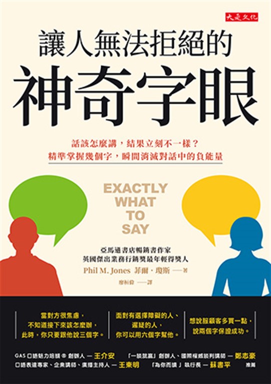 內容簡介 西門子、滙豐銀行、微軟、瑞聲達(ReSound)、DHL……國際企業, 超過200萬學員受過這套神奇字眼的訓練。 ◎當對方很焦慮,不知道接下來該怎麼辦,此時,你只要跟他說三個字。 ◎面對有選擇障礙的人、遲疑的人,你可以用六個字幫他。 ◎想說服顧客多買一點,說兩個字保證成功。 ◎說一堆理由來搪塞,你要怎麼說,對方會推翻自己的成見。 一句話到底該怎麼講,才能讓結果不一樣? 為什麼有人只要簡單改變幾個字,就能消滅彼此對話的負能量? 作者菲爾‧瓊斯(Phil M. Jones)是亞馬遜書店暢銷書作家, 也是英國傑出業務行銷獎創辦以來,最年輕的得獎人。 他在50個國家以上、開設2,000堂溝通術,提供23種語言戰略。 共有超過200萬人受過他的訓練。 菲爾‧瓊斯在研究人與人間的互動時發現,成功人士都有三個共通點: 知道該說什麼話、以何種方式開口、怎麼讓說出口的話見效, 這些話,就是讓人無法拒絕的神奇字眼。 ◎講這幾個字,讓對方的潛意識從排斥變成接納: 「我不曉得你有沒有興趣,但是……」 「你願意試試嗎?」 「你對……有什麼看法?」 「假如……你覺得如何?」 「想像一下……」 想要別人做他平常不會做的事,以上這幾句話非常有效。 為什麼?因為人們只會因為兩件事動起來:避免損失、有正面收穫。 ◎人在做任何決定前……你講這些神奇字眼,能瞬間改變人的決定: 「大多數人……」 「接下來呢……」 「幫個忙……」 「就我看來,你有三種選擇……」 想要對方別猶豫、馬上給答案,或順著你的期待而行動,以上這幾句非常有效。 「我只是有點好奇……」(講這句,常能打消對方的拒絕理由) 「好消息是……」(降低壞消息效應的開場白) 講前者,因為人都怕被貼標籤,也怕與人衝突;講後者,則能讓對話持續下去。 還有,簡報或會議的最後,想要大家踴躍發問,避免冷場尷尬, 千萬不要問:「大家有沒有問題?」你應該說…… 要怎麼讓人再忙也撥空見你? 怎麼引導對方好好聽完你的話?怎麼要到手機號碼? 遇到拖延、耍賴、忘記了的人,怎麼嚴厲催促卻又不會惹惱對方? 本書有答案。 對了,既然你看完簡介就決定買這本書了,「還有一件事……」