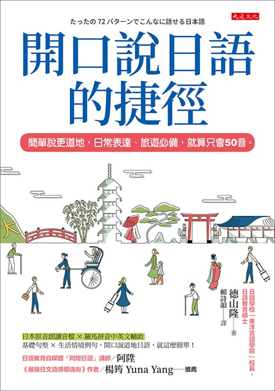 內容簡介 日本原音朗讀音檔 × 羅馬拼音中英文輔助 基礎句型 × 生活情境例句,開口說道地日語,就這麼簡單! 本書作者德山隆,擁有日語教育碩士學歷, 目前擔任日語學校「東洋言語學院」校長。 他整理出日語基礎會話最常用的72個句型, 每個單元都附上例句朗讀音檔QR Code, 就算只會50音,簡單套用就能說得很道地! ◎日常表達、旅遊必備基礎句型 .與人碰面,最重要的自我介紹,日語怎麼說? 只要記得這個句型:私は○○です。 ○○不只能代入你的名字, 你是臺灣人(台湾人)、上班族(会社員)或學生(学生),都用這個句子說。 .找不到路、沒看到想要的商品,要怎麼開口問? 物品、建築等無生命的存在(中文通常會說「有」),用あります。 例如:「近くに コンビニは ありますか?」(附近有便利商店嗎?)、 「Sサイズは ありますか?」(有S號嗎?) .沒把握能聽懂日語,想問店員會不會說中文/英語, 你可以說:「中国語(英語)を 話すことができますか?」 學會できます用法,任何能力、可以做的事都能照套。 .到日本旅遊、購物,你一定要學會這句: 「カードで 払ってもいいですか?」(可以刷卡嗎?) ~してもいいです表示可以,不可以則變化為~しては いけません, 無論店員回答什麼,你都能聽懂。 ◎讓你日文更道地的慣用句 .謝謝的基本用法ありがとう,你一定聽過, 但如果特別感謝對方的幫忙,可以用~してくれて ありがとう, 例如:「助けてくれてありがとう」(謝謝你幫我)、 「荷物を 持ってくれてありがとう」(謝謝你幫我提行李)。 .想買什麼,用ほしいです。「車がほしい」,就是想要車。 買不到但想要的(例如男/女朋友),也可以用 (只要把單字換成:男朋友「彼氏」、女朋友「彼女」)。 .推測、不確定的事,中文用「聽說、好像」,日語卻有多種表現: ~だそうです,表示聽說的事;~らしい,有根據的推測; 自己的推測,則要用~のようです。 用對了,別人一秒就懂。 本書所有漢字皆標上假名,例句有羅馬拼音輔助, 並提供中文、英語翻譯,讓你看懂句意與時態變化。 另附50音假名表、常用動詞與形容詞,以及旅遊、生活必備基本單字, 簡單說就能很道地。