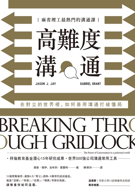 內容簡介 ~麻省理工最重要的溝通課~拜倫教育基金潛心15年研究成果, 如何越過「遭人誤解」、「防衛」、「沉默」、「對立」等潛在風險, 以有效溝通打破對立僵局? 還記得上次你跟意見相左的人,討論重要話題時的情況嗎? 你們談得怎麼樣? 這類對話非常重要,卻往往會陷入僵局。 當和陌生人談到「永續發展」、「社會正義」和「公共衛生」, 我們內心響起警鈴——有些話題太具爭議性,不適合談論。 為了避開唇槍舌劍,我們選擇閉口不言,轉身和同溫層裡的人們提出倡議。 事實是,如果我們只靠跟主張社會正義者溝通,並不能解決貧困問題和人權問題。 只靠召集熱心的環保主義者,也無法解決全球氣候變遷、棲息地破壞和水汙染等問題。 但當我們鼓起勇氣,試圖傳遞觀念,卻發現——我們怎麼講不下去了? ▇▇▇▇▇▇▇▇▇▇▇▇讓對話陷入僵局的,正是我們自己▇▇▇▇▇▇▇▇▇▇▇▇▇ 當跟他人對話時,我們也帶了內在偏見這潛在包袱。 【自以為正確】、【自以為正義化身】、【自以為確定無疑】、【自以為安全】 是溝通障礙的四大誘餌,我們往往下意識認為: .我比你更有美德(因為我用環保吸管、上下班騎自行車) .我比你看得更遠(我懂得運用理性,從科學的角度看待問題) .我比你了解狀況(我讀過很多相關書籍,還有一些哲學) .我不想聽你說下去(你聽不懂我在表達什麼,而且扭曲事實) 最後——我們非但無法改變他人的想法,還製造了對立。 ▇▇▇▇▇▇▇▇▇▇31則練習越過潛在風險,轉變溝通路徑▇▇▇▇▇▇▇▇▇▇▇▇ 作者傑森‧傑伊、加布列‧葛蘭特邀請我們帶著「認真玩」的精神, 在從反思到行動的同時,還能一邊笑看自己。 當你陷入【挫折】、【暴躁】、【自大】、【冷淡】、【咄咄逼人】等潛在狀態, 談話很容易會不歡而散。 拜倫教育基金潛心研究15年,運用31則啟發人心的練習,轉變溝通路徑。 這套系統為世界500強公司, 包含資誠(Pw)、星巴克(Starbucks)、全食超市(Whole Foods) 用以提升管理者溝通技巧、精進組織效率: .找出我們沒有說出口的內在對話 .注意你在分享的「動機」 .找出你所屬社運組織的核心衝突 .了解彼此的價值觀,超越單維度的對話 .想出不必在不同價值觀或不同目標之間做取捨的方法 最後你會漸漸具備一種能力—— 能跟任何人討論你最重視的問題,並達到預期成效。 我們可能永遠也不知道,我們的對話會引導我們到何種境界。 肯定的是,當你練習你在這本書裡學到的技能時, 你會得到勇氣和能力,在愈來愈大的舞台上打破僵局與對立。 為自己或你所屬社運組織開闢前進的通道, ——我們開始行動吧! 本書特色 ◎麻省理工最熱門的溝通課!拜倫教育基金潛心15年研究成果!世界500強公司、資誠(Pw)、星巴克(Starbucks)、全食超市(Whole Foods)NGO的溝通領域工具。 ◎31個實戰練習、避開4大「對立」誘餌、9種替代談話通道,打破溝通僵局! ◎探究個人或組織的核心衝突,以及「在什麼地方落入集體陷阱」,讓聲量突破同溫層,創造集體前進的通道。 各界推薦 ◎這是一本寫給變革推動者的實務操作手冊,告訴我們如何弭平差異,創造有效溝通,成就實際行動。──亞當‧格蘭特,《紐約時報》暢銷書《反叛,改變世界的力量》及《給予》作者 ◎這本書不是寫給膽小鬼看的。不過,如果你真的想改變世界,就一定要好好看看這本書。這本書向身為倡議人士、公民或人類一份子的我們提出挑戰,要我們認識自己的動機和假設,藉此與我們反對和躲避的人們達成共識。這本書也要求我們丟掉自以為確定無疑和自以為是的感覺,好讓我們能不同的新方法達成目標。而且,這本書還提供我們達成目標的方法與祕訣。──葛溫‧魯塔(Gwen Ruta),美國環境保護基金會氣候與能源部資深副總裁 ◎我們國家的未來取決於我們與不同意見者進行溝通的能力,傑伊和葛蘭特指引我們,開啟對我們的民主制度至關重要的對話。──范‧瓊斯(Van Jones),夢想企業(The Dream Corps)共同創辦人暨總裁,CNN政治評論員兼主持人暨作家 ◎我們需要從相互對抗的角度都能利用的創造力,來創造成長的組織和繁榮的社會。這本書就為我們提供這種工具。──約翰‧麥基(John Mackey),全食超市(Whole Foods Market)執行長 ◎傑森‧傑伊和加布列‧葛蘭特認為,讓我們的許多公開互動或私人互動飽受折磨的對話僵局,唯有靠「真誠」這項關鍵才得能破除。作者強調我們落入的陷阱,以及擺脫陷阱的有效方法。雖然做起來不容易,但你可以使用作者提供的練習,避免我們在不自知的情況下造成對立。──勞倫斯‧蘇斯金(Lawrence Susskind),共識建立協會(Consensus Building Institute)創始人,麻省理工學院都市與環境規劃教授,哈佛大學法學院協商計畫研究院副主持人 ◎無論你想改變的是你的企業、你的社區、或是你自己,傑伊和葛蘭特合寫的這本簡明實務指南,都能讓你會心一笑,並激勵你開始行動。──克莉斯汀‧巴德(Christine Bader),《企業理想主義者的進化》(The Evolution of a Corporate Idealist)作者 ◎謹以本書獻給我們的小孩,維克拉姆、烏瑪、艾瑞亞娜和瑪德琳:與人鬥,引戰事;與己鬥,得和平。──哈茲拉特‧伊那業特‧可汗(Hazart Inayat Khan,蘇菲教派創始人) 推薦專序 ◎從社群媒體裏與日常接觸中,我們了解不論人類科技如何發達、生活水平如何提升,溝通類型可能轉變,但是難度卻不