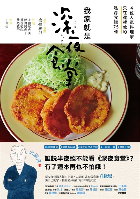 內容簡介 誰說半夜絕不能看《深夜食堂》?有了這本再也不怕餓!日本人氣料理家親自上菜75道日式家常食譜~升級版~讓自己的家,輕鬆變身最舒適美味的食堂#大滿足❤ #專業感Up! #5分鐘上菜 #療癒系料理 #一盤接一盤 #保證上癮回家就可以立刻開吃──這就是能夠天天上菜的祕訣!由4位深夜食堂職人用心研發的「升級版」菜單,不用5個步驟就能完成的家常美味,還有提味、擺盤、拍照訣竅不藏私分享。第1章:5分鐘速成!我家的深夜食堂料理前10名第2章:絕品!饑腸轆轆的時候,令人飽足的飯菜第3章:讓身心都溫暖起來,疲倦時刻的療癒系菜單第4章:今晚喝點酒!想喝一杯,搭配簡單的下酒菜第5章:深夜吃或減肥中都不怕!可以盡量吃也不會發胖的晚餐今天,你想在家享用哪一種深夜食堂料理?「深夜食堂」系列食譜第三彈,由人氣料理家擔任一日老闆,讓美味更升級!★料理家①:小堀紀代美──親自開設的料理教室總是一位難求!小堀老師擅長以香料入菜,特別介紹花椒與肉桂,能快速提升料理的香氣;而若想讓常見的醬汁多些風味,只要加入石蓴菜,無論冷著吃、熱著吃都美味。小堀老師的升級版料理有:蜆湯、馬鈴薯沙拉、雞肉丸麵線、芝麻醬涼麵、酒蒸蛤蜊等。★料理家②:坂田阿希子──從小菜到甜點樣樣精通的全能好手。在法式餐廳累積多年經驗,坂田老師介紹的美味多蜜醬汁,讓炸牛排的口感更豐富出色。老家在新瀉,她對家常料理也熟悉,只要在煎餃裡加入炒蛋跟小黃瓜,外酥內軟保證讓人一吃就上癮。坂田老師的升級版料理有:奶油飯、炸牛排、蛋包飯、馬鈴薯燉肉、精力豬肉丼等。★料理家③:重信初江──擅長使用隨手可得的食材製作美味料理~活躍於料理節目與雜誌,重信老師深諳饕客想吃又怕發胖的心情,特別提醒大家:把白飯或麵換成蒟蒻絲,熱量與糖質瞬間降低;想要暖胃又健康,這道豆腐料理一定要學起來!重信老師的升級版料理有:棒棒雞、肉末豆腐、酸菜白肉鍋、各種豬肉卷、香菇鮭魚錫箔燒等。★料理家④:徒然花子──在IG與Twitter上享有高度注目的人氣料理家!深愛美食佐美酒的徒然老師,充滿變化的簡單下酒菜讓人食欲大開。不只與任何酒都相搭,聽到菜名就好吃,更是拍攝美食照絕對不能錯過的。徒然老師的升級版料理有:吻仔魚蔥香玉子燒、鮪魚檸檬洋蔥絲、厚切火腿排佐蘋果粒醬汁、蔥味噌乳酪炸雞柳等。******沒看過《深夜食堂》漫畫也OK,日本讀者好吃+好用+好看,大滿足推薦!「超讚的食譜!買來馬上就看著做來吃,每一道都很美味。」「光用看的就很開心,實際跟著做更開心,還很美味。這本食譜真是太棒了!」「不僅食譜實用,照片中器皿跟料理的搭配也好美,看了就覺得幸福。」安倍夜郎作品《深夜食堂》以都會巷弄裡只在深夜營業的小食堂為舞台,將老闆做的家常料理,添上形形色色來客的動人故事調味,時而溫馨時而憂愁,不僅散發出料理的香氣,也洋溢著最質樸的人情味。《深夜食堂》自2006年起在《Big Comic Original》雜誌連載,榮獲「第55回小學館漫畫賞」、「第39回漫畫家協會賞大賞」等大獎,作品氣氛濃郁、風格特殊,更五度改編日劇,二度搬上大銀幕,廣受好評。這股深夜料理佐人情百味的熱潮迅速風靡全亞洲,全系列銷售突破六百萬冊,成功締造跨國籍的料理圖文新品種。名人推薦 Hally Chen(《喫茶萬歲》作者) James(FIKA FIKA Cafe創辦人) 王玉萍(寫寫字採編學堂創辦人) 比才(《家酒場》作者、「比家的日式餐桌」主人) 馬世芳(廣播人‧作家) 莊祖宜(作家) 番紅花(作家) 葉怡蘭(作家) 韓良憶(作家) 蘿潔塔的廚房/蘿潔塔(料理頻道百萬Youtuber)──好吃推薦日本讀者好評 ◎這本食譜超棒的!馬上就看著做來吃,每一道都非常美味。 ◎光用看的就很開心,實際跟著做(料理)更是開心,還很美味。有它真是太好了! ◎書裡有安倍夜郎為每位料理家畫的人像,十足《深夜食堂》風格,很是討喜。 ◎因為喜歡《深夜食堂》,想都沒想就買了。食譜很實用,照片中器皿跟料理的搭配也好美,看著就覺得幸福。 ◎好像登場人物在一一跟讀者介紹一番,這本食譜讀來非常有趣。