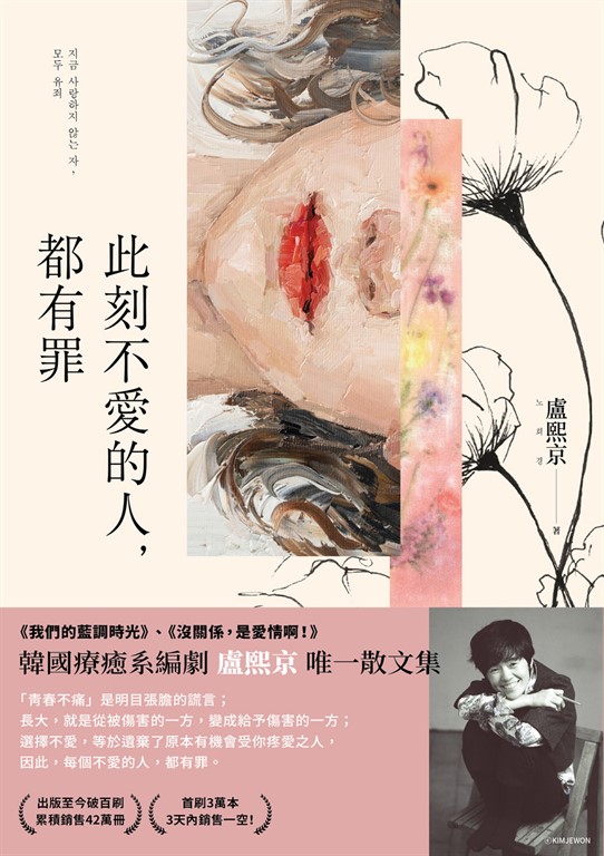 內容簡介 「青春不痛」是明目張膽的謊言;長大,就是從被傷害的一方,變成傷人的一方;不去愛,等於遺棄了原本可能受你疼愛之人……因此,此刻不愛的人,都有罪。《我們的藍調時光》、《沒關係,是愛情啊!》韓國療癒系編劇 盧熙京 唯一散文集★出版至今破百刷,累積銷售42萬冊★首刷3萬本,3天內銷售一空!韓國數十萬讀者,感動推薦!*這是我的人生之書。盧熙京在本書中所寫的是比戲劇更深刻的事情,無關乎完不完美,而是我們之所以為人而擁有的無數情感與可能的醜陋。*無論戲劇、劇本、故事或散文,盧熙京筆下的一切每每都讓我讀到落淚。*這本書讓我看見了盧熙京完全不一樣的另一面,改變了我對她的印象。*一口氣讀完,又重覆讀了一遍又一遍!我會向身邊每個人都推薦這本書!*盧熙京比其他人都更溫暖、更誠實、也更透明地看待這個世界,所以痛苦,所以精緻,所以令人久久回味。*她筆下的文字,通過愛、恨、怨等多種情緒所創造出來,那麼痛苦,同時也那麼堅強。*盧熙京的文字充滿愛、理解和撫慰。面對愛情,她說:即使三十年來從未談過戀愛,即使苦心經營三百天的戀情宣布告吹,沒關係。因為重新感受愛的悸動,只在一瞬之間。面對長大,她說:成為大人,就是從被傷害的一方,變成傷人的一方。當你察覺自己傷害到別人的時候,就意味著你已經成為了大人。面對遺憾,她說:轟轟烈烈地愛過,再離開人世吧。好好去愛、不留遺憾地愛、毫無保留地愛,就不會有後悔和留戀。面對錯誤,她說:有人說,世上最暴力的話是:「要像個男人、像個女人、像個媽媽、像個醫生、像個學生……」其實,每個人都是第一次體驗今生,所以才會比較生疏笨拙、惹人憐憫……因此,就算犯錯也無所謂。面對友情,她說:任何人,不只朋友,就連父母、手足,都不比自己來得重要。人生在世,會遇到許多讓人感到孤單寂寞、痛苦難耐、隻身一人的情況。儘管如此,依舊能成為朋友的人,才是真正的朋友。面對寫作,她說:好比戀愛時自信滿滿,戀情結束後才意識到自己有諸多不足;寫作亦然。倘若現在的你正在寫劇本,感到孤單、熾烈,也對自身的懶惰感到憤怒的話,各位必然已經走在成為編劇的正途上。◆回看編劇人生30年,盧熙京想說──「編劇盧熙京,花了很多時間怨恨並憎恨這個世界。「多年來,我一直將理解和愛放在腦海中,卻沒有放在心上。然後,我進入了編劇這一行。創作的時候,我和角色打了很多場架,我時常流著淚問:『你是不是也生病了?』就這樣過去好幾年。直到現在,我才一點一點地掙脫心靈的枷鎖。有時候還是會感到痛苦,有時候還是會留戀,於是我才意識到,沒有人能夠毫無怨恨地過生活。「即使是現在,我也相信,我們賴以生存的力量就是『理解』和『安慰』。即使沒有我,每個人也必須勇敢地承受這個人世間的苦難。我於2008年首次出版的《此刻不愛的人,都有罪》這本書重新問世,為此,我新寫了幾篇文章及手寫短句,希望能帶給讀者如朋友般的支持,或者如母親的心那般的幸福。」30篇人生隨筆,比戲劇更誠摯動人的文字,盧熙京鼓勵讀者勇敢去愛、勇敢做錯、勇敢面對,讓這一生,不留遺憾。 韓國數十萬讀者,感動推薦! *這是我的人生之書。盧熙京在本書中所寫的是比戲劇更深刻的事情,無關乎完不完美,而是我們之所以為人而擁有的無數情感與可能的醜陋。 *無論戲劇、劇本、故事或散文,盧熙京筆下的一切每每都讓我讀到落淚。 *這本書讓我看見了盧熙京完全不一樣的另一面,改變了我對她的印象。 *一口氣讀完,又重覆讀了一遍又一遍!我會向身邊每個人都推薦這本書! *盧熙京比其他人都更溫暖、更誠實、也更透明地看待這個世界,所以痛苦,所以精緻,所以令人久久回味。 *她筆下的文字,通過愛、恨、怨等多種情緒所創造出來,那麼痛苦,同時也那麼堅強。 *盧熙京的文字充滿愛、理解和撫慰。