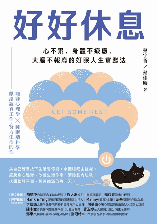 作者介紹 蔡宇哲 心理學博士《哇賽心理學》創辦人兼總編輯。中正大學心理學博士,專精於睡眠研究,曾任高雄醫學大學心理學系專任助理教授、台灣應用心理學會理事長。現為中華正向心理學發展協會榮譽理事長、台灣應用心理學會監事、台灣科學媒體協會監事、台灣睡眠醫學學會大眾教育委員會委員、台灣睡眠醫學學會失眠認知行為治療認證課程講師。2015年創辦《哇賽心理學》,以「理性中帶有溫暖,療癒中帶點知識」的講解方式,與大眾分享睡眠與心理學的奧妙之處。2020年開始經營《哇賽心理學》同名Podcast節目,並於2020、2021、2022年獲得Apple podcast年度熱門與精選節目,並開設Youtube節目:《哇賽讀心書》、《睡眠先生的活力學》。除了經營自媒體頻道,也將專業與研究轉換成線上課程,包括《疲勞修復X重振專注力|高效睡眠休息法》、《自律讓你更自由》;有聲書《睡眠管理職人的好眠教室》。著有《神奇的心理學》、《哇賽心理學》、《用心理學發現微幸福》、《轉個念,解鎖學習密碼》。蔡佳璇 臨床心理師雙寶媽,同時為《哇賽心理學》Podcast頻道主持人兼執行編輯。高雄醫學大學臨床心理所碩士,現職禾好心理治療所,並擔任台灣生理回饋與神經回饋學會理事、台灣臨床心理學