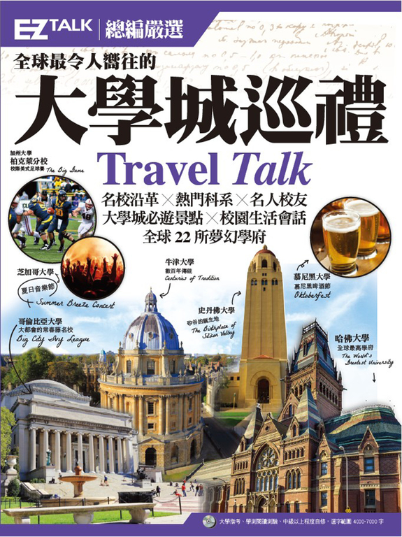 內容簡介 這是一本⋯⋯旅遊導覽?英語學習書?留遊學指南?答案:以上皆是!根據《泰晤士高等教育世界大學排名》嚴選全球 22 所知名百年名校豐富你的國際視野,同時厚植英語實力! ★一流學府獨步全球的教學特色為何?最熱門科系?有什麼趣聞軼事?出了哪些名人? ★大學城周邊有哪些大文豪、哲學家、科學家常出沒的小店? ★在地人、校友又推薦了哪些好吃好玩的景點? ★百年名校文化、留遊學生活、求學大小事,答案盡在《大學城巡禮》!本書特色 特色一:名校沿革,一窺精英學府的悠久文化 專文介紹創校歷史、教學特色、特殊傳統、傑出校友、校際宿敵⋯⋯多面向介紹全球知名大學,除了認識各校背景,還可增進英文閱讀實力,一舉多得! 》校內有學生監獄的名校?! 德國海德堡大學的學生監獄(Studentenkarzer)在 1914 年以前作為囚禁行為不良學生之用。 》學生幾乎不必進教室上課的名校?! 牛津大學的學士生都有學術專家作為導師,學生大部分時間都在自修,每週與導師討論自己的研究。 》公民保證入學的世界名校? 愛因斯坦的母校蘇黎世聯邦理工學院是國際學生擠破頭想進的學校,不過瑞士公民只要通過高中畢業考,即能保證入學。 特色二:特選全球大學城 180+ 景點,吃喝玩樂一應俱全 蒐集在地人秘傳及畢業校友推薦景點,整理出各校周邊好逛、好吃、好買的景點導覽,媲美專業旅遊指南,規劃文藝之旅路線就看這一本! 》牛頓的蘋果樹 劍橋大學三一學院正門邊的小花園裡有一棵「牛頓的蘋果樹」。事實上,這不是砸到牛頓的那棵蘋果樹,但牛頓在三一學院期間住宿的房間就在這片花園附近,牛頓也常常來這裡散步。 》走進去看不到一本書的圖書館? 芝加哥大學的曼索托圖書館藏書都在地下室,只要連上圖書館網頁搜尋圖書,機器手臂就能把書挑出來,再發簡訊通知借書者到前台領書。 》智慧女神當月老?! 哥倫比亞大學洛氏紀念圖書館前的「智慧女神」(Alma Mater)雕像衣袍褶皺中藏有一頭貓頭鷹,傳說找到貓頭鷹的男學生會在學校對面的巴納德女子學院遇見自己的新娘。 特色三:校園會話+景點會話,留學、旅遊都適用 》校園會話:針對校園生活編寫,包括申請學校、選課、參加社團等面向。 Heidi: Did you have to prove your proficiency in German to study here? (你需要證明自己的德文好到可以在這裡唸書嗎?) Joseph: No. My graduate program is in English, so I had to provide TOEFL scores. (不用啊。我的研究所課程是用英語授課的,所以我要拿的是托福成績。) Heidi: But you still need German for your daily life, right? (但你日常生活還是會用到德文,對吧?) Joseph: Yes. I started using DUO to study online before I came here, and I kept taking the lessons after I got here. I’m on the Intermediate Level now. (對啊。我來這裡之前就開始使用 DUO 線上課程,到這裡以後還是繼續上課。現在已經上到中級了。) 》景點會話:遊覽大學城景點時會派上用場的對話,讓你快速與在地人打成一片! Greg: I didn’t realize how huge and lush Central Park is. (我還真不知道中央公園會這麼大,這麼綠油油一片。) Nora: Yeah. It’s known as the “lungs of New York.” It even has its own police department. (是啊。它有「紐約之肺」的美名。這裡甚至有專屬的警察局。) Greg: Ha. That’s big. Is that a museum up ahead? It looks familiar. (哈,還真大。前面那是一座博物館嗎?看起來很眼熟。) Nora: Yes. That’s where we’re going. It’s the American Museum of Natural History, and you probably recognize it from Night at the Museum. (沒錯。我們就是要去那裡。那是美國自然歷史博物館,你大概是在《博物館夜驚魂》看過才認出來。)
