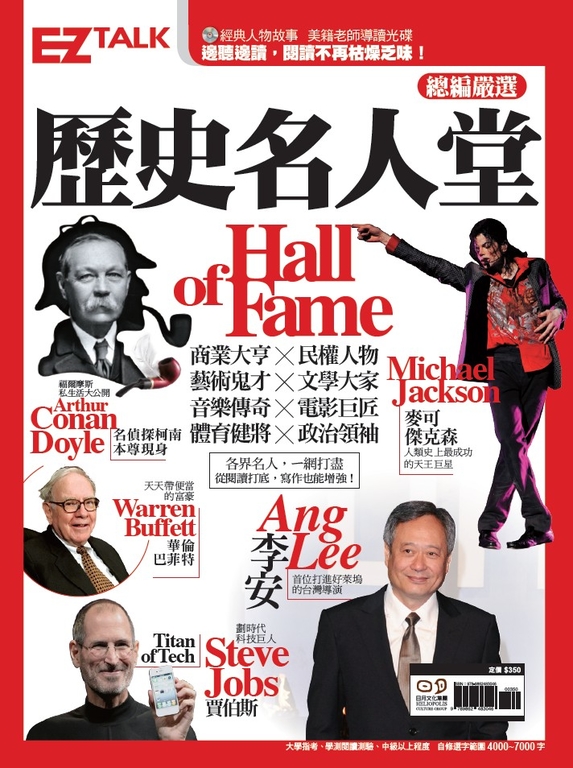 | 簡介 / | 歷史名人堂 Hall of Fame(無附MP3音檔) (電子書):EZTALK年度暢銷「總編嚴選」系列帶領你認識科技富豪,英國文豪,體壇巨星、電影巨匠,政治領袖等30名全球各界名人不但增 |