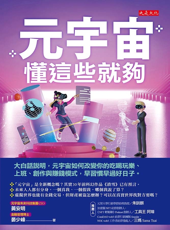| 簡介 / | 元宇宙,懂這些就夠 (電子書):什麼是元宇宙(Metaverse)?就是Meta(超越)+Verse(宇宙)這兩個字的組合。就是藉由虛擬實境(VR)、擴增實境(AR)等數位技術搭建的虛 |