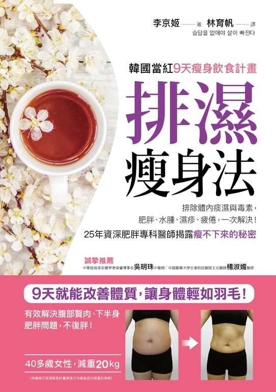內容簡介 ★韓國當紅!「9天排濕瘦身計畫」★身體就像水管,當水堵住時,就容易生病,體內的「痰濕」是一切疾病來源,下半身肥胖、游泳圈、中年肥、浮腫、疲勞、慢性病……實行「排濕瘦身法」,9天後,你的身體將輕如羽毛【從學生到主婦都在做,排濕瘦身效果驚人】■排濕瘦身法讓我減了十三公斤,折磨我超過十年的疲憊感、水腫、肌肉痛全都消失了! (金英順/49歲,自營業)■排濕瘦身法解決了令我深感自卑的下半身肥胖問題,整個人明顯小了一號,以前穿不下的褲子也穿進去了。(李藝娜/20歲,學生)■排濕瘦身法讓我養成規律的生活作息,不但消化不良與頻繁腹瀉的症狀獲得改善,連水腫問題和疲憊感也大幅減少。 (朴明植/46歲,銀行員)■在減肥停滯期來臨之際,我展開了排濕瘦身計畫,除了體重再度減少外,牛皮癬等整體身體狀況也都改善了。(崔美慈/58歲,主婦)●你的肥胖,很可能是痰濕惹的禍!☐消化不良時會脹氣,即使吃得不多,肚子也會漲漲、悶悶的。☐容易水腫,早上起床時戒指戴不上,或是到了晚上鞋子變太緊。☐常常覺得身體沈重,容易疲倦。☐雖然容易入睡,但早上爬不起來。☐覺得頭很重,常常有暈眩感。☐對任何事提不起勁,性慾也減退。以上症狀如果你有超過3個,你就是體內有「痰濕」。一旦痰濕堆積就會造成身體狀況不佳,接著便陷入代謝變差的惡性循環中,最後演變成一般方式都瘦不下來的惡性肥胖。●痰濕——堆積在體內的老廢物質人體無法正常代謝所產生的殘留物、老廢物質,即為痰濕,如果痰濕累積在體內過久就會造成身體機能異常,也就是「痰濕症」,等於西醫的「代謝症候群」。女性、有虛冷症的人,以及過了中年的男性,都是最容易產生痰濕堆積的對象。痰濕一旦堆積,就如同「垃圾留在屋內」,是導致腹部贅肉、下半身肥胖最主要成因!除此之外,也是引發慢性鼻炎、高血壓、高脂血症、糖尿病、類風濕性關節炎、腸躁症、心臟疾病、慢性疲勞、腦血管疾病、成人痘、各種癌症、異位性皮膚炎等疾病的來源。●「祛濕」:排除廢物,身輕如燕——最符合身體環保的自然瘦身法本書作者是25年經驗資深名醫,多年看診經驗發現萬病根源,要從痰濕下手。她獨創了「排濕飲食計畫」,不僅幫助許多患者順利排痰濕,也讓許多怎麼努力都瘦不下來的人,迅速看出成效。許多患者體驗後,最大感受就是「沉重的身體頓時變輕鬆」了。種種惱人的症狀,不藥而癒。一直減不下來體重,更明顯減輕。作者指出,「排濕瘦身法」只不過是把長期囤積在身體內的垃圾清掉而已,是最自然健康的瘦身法。●9天排濕飲食計畫——3階段讓身體「除舊生新」「排濕瘦身法」最主要是促進除舊生新作用,把體內老廢物質清掉,再補充健康的飲食。為了達到這樣目的,規畫了9天的飲食計畫,並分成3階段進行。包括3天減食期、3天禁食期、3天恢復期。‧第一階段︱減食期(第1~3天)此時期為降低禁食期期間對身體造成的負擔,會逐漸減少用餐量。只要好好度過減食期,便能預防禁食期會出現的暈眩、空腹感、頭痛、失眠、易怒、不安等症狀。‧第二階段︱禁食期(第4~6天)消化器官休息的時期,也是除舊生新作用最旺盛的期間。期間不吃固體食物,只喝氣血茶、氣血飲來補充營養與飽腹。‧第三階段︱恢復期(第7~9天)禁食後為恢復正常飲食,此時期會逐步增加鹽分攝取量與用餐量。恢復期應過得比禁食期謹慎,以防止復胖。健康的禁食是以慢慢減少用餐量,接著一段時間不吃固體食物,然後再慢慢增加用餐量的方式進行,與挨餓減肥法截然不同。基本上,三天減食期與三天恢復期等同於正常飲食,僅需控制用餐量,期間只要謹守三件事:1.每天喝氣血茶。2.第4到6天喝氣血飲取代正餐。3.每天快走40分鐘。作者在書中詳盡說明這三個階段的飲食建議,以及氣血茶與氣血飲的作法。書末還搭配實踐手冊,幫助記錄9天的療程,有效管理飲食。本書雖然是以痰濕症的代表症狀「肥胖」為主題,涵括了許多減重的內容,但不只是單純講減重的書籍。排濕瘦身法消除了贅肉,也排除了體內堆積的廢物,透過排濕瘦身法,不只惡性肥胖,醫院無法明確診斷出的過勞、原因不明的皮膚疾病、浮腫、狀態不佳等,都能消除。甚至每隔幾年就創新高的高血壓、糖尿病、高血脂症、腦血管疾病、心臟疾病等也能改善。【本書特色】‧排濕瘦身法的特徵是它既簡單又簡短,但是效果顯著且不會復胖,與挨餓減肥法截然不同。‧飲食方法很明確,一共只要實行9天,身體就能出現改變,且食材及藥材都容易取得。‧書末附錄實踐手冊,幫助記錄9天的瘦身療程,有效管理飲食。