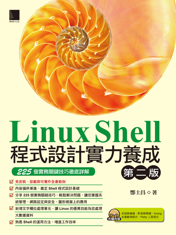 商品描述 | Linux Shell程式設計實力養成(第二版):225個實務關鍵技巧徹底詳解 (電子書):★免安裝、掛載即可實作的全書範例★內容循序漸進,奠定Shell程式設計基礎★分享225個實務關 |