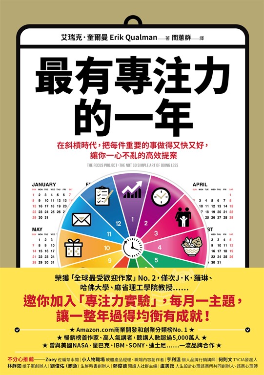 內容簡介 專心,是各界菁英一致認同的成功關鍵,但身處最容易分心的斜槓時代,提升專注力的方法推陳出新,到底哪些才真正有效?榮獲「全球最受歡迎作家」No. 2,僅次J.K.羅琳、哈佛大學、麻省理工學院教授……邀你加入「專注力實驗」,每月一主題,工作、家庭、健康、心靈、人際……讓一整年過得均衡有成就!★ Amazon.com商業開發和創業分類榜No. 1★ 暢銷榜首作家、高人氣講者,聽講人數超過5,000萬人★ 曾與美國NASA、星巴克、IBM、SONY、迪士尼……一流品牌合作◎ 專心,是斜槓世代的一大挑戰身處斜槓時代,人人皆有多重身分,你可能是上班族兼家長、老闆兼業務、醫療人員兼網路作家……無論身分為何,多數人都有以下煩惱:.有做不完的待辦清單,卻沒有實現任何目標.感到自己很忙碌,但沒有效率.嘗試了很多事情,仍找不到方向.一直處於疲憊狀態,沒有時間放鬆或深度思考◎ 公認邁向成功的必備條件──專注哈佛大學和麻省理工學院教授艾瑞克.奎爾曼,也是普立茲獎提名作家、全球最受歡迎作家No. 2,僅次J.K.羅琳,當他與各界成功人士進行無數交流後,他發現,就連Facebook、IBM、三星的大老闆,也會面對相同的挑戰,但他們卻一致認為,保持專注,優先做好最重要的事,才能脫穎而出。◎ 過得一心不亂的生活提案──專注力實驗為了解決分心,無論是書籍或工具,各種提升專注力的方法推陳出新,於是,奎爾曼提出各種疑問:.專注說起來很簡單,但要如何做到?.專注跟肌肉一樣,可以愈鍛鍊愈厲害嗎?.專注能成為一種習慣嗎?.覺得重要的事很多,如何才能面面俱到?因此,他為自己的生活設計提案,展開為期一年的專注力實驗,1年12個月,每個月專注在一個領域,看看提升專注力的方法哪些有效,哪些無效,也讓生活和工作相輔相成,不失衡──.提升業績成長:使用「10枚金幣提問法」、避開「選擇超載」、懂得「適時放手」…….有效管理時間:實踐「牛仔排程法」、擬定「勿做清單」、執行「3分鐘順手做」…….珍惜家人朋友:設立「52夜原則」、使用「人生減脂術」、學會「俐落說『不』」…….專注活在當下:理解「狄德羅效應」、書寫「一句話日記」、活用「52 17法」…….對症下藥付出:善用「不准打7分規則」、力行「裝滿他人水桶」……本書還有更多專注力實驗,奎爾曼也會分享自己的執行成效,並打上分數,跟著他一起進行實驗,你也可以找到適合自己的方法,在分心時代,還能一心不亂,把每一件重要的事做得又快又好,工作與生活均衡發展,每年都過得有意義又有成就!
