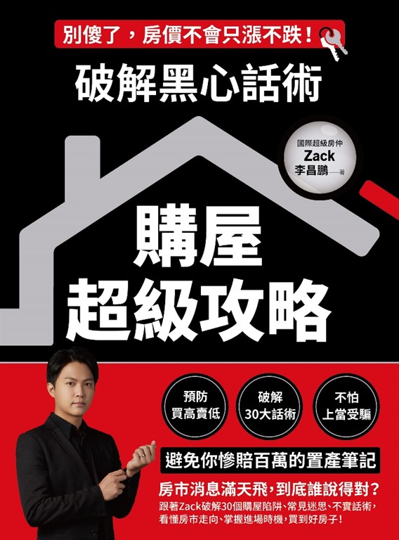 內容簡介 房價只漲不跌,現在不買,以後更買不起?Location不是最重要的,進場Timing才是關鍵?「國際超級房仲」Zack教你看懂局勢,掌握買屋、賣屋、換屋的關鍵技巧,買在低點、賣在高點!▌本書適合哪些人?1. 準備買屋 賣屋的房產新手買屋、賣屋、換屋,該做哪些功課,才不會一小心就慘賠百萬。看完本書你會全盤了解,不用擔心上當受騙!2. 將買房視為人生心願的小資首購族買房是要趁房市熱絡時買,還是房市冷卻時再行動?先買小套房,還是存夠錢再買大房子?貸款成數怎麼抓?聽完本書的分析,你就會知道如何決定。3. 想要當包租公、購入第二間房子的人想要當包租公、想要到國外置產,如何控管風險?租金投報率如何計算?如何判斷房子是否有投資價值?看完本書,你就會知道如何為自己的資產做最大化的配置。4. 沒有財經知識、看不懂複雜數字的人本書直白易懂、含金量高,不管是否有相關背景,都能全面搞懂房市的遊戲規則!5. 無法分辨真偽、害怕掉入房市陷阱的人認真爬文、做了許多功課,但面對龐大的資訊卻依舊是霧裡看花,不知如何分辨?本書破解房仲說術,讓數據說話,用數字與圖表分析,帶你看透房市的真實樣貌!▌揭開房市黑幕,避免你慘賠百萬的置產筆記專家說Location、Location、Location,地段就是一切? 長輩說買房可以養老、抗通膨?房仲說,房價只會越來越貴,早買早享受、現在不買以後會後悔?眾說紛紜的建議,真的都是對的嗎?本書不以「感覺」判斷,而是回歸理性分析、讓市場事實說話,看完本書,你將可以──.精準預測房市走向,避免被當韭菜.選擇進場的最佳時機,買屋、賣屋精準出手.不被市場帶風向,別人貪婪我清醒.破解黑心房仲話術,比臺灣90%的房仲業者更懂房地產.為自己的資產布局,正確換屋,讓一間房變兩間房▌Zack是誰,為什麼要聽他說?Zack的父母曾是資歷超過三十年的資深房仲,從小見證家中經濟跟著臺灣房地產大起大落。長大後,跟隨父母的腳步進入傳統房仲業,見識到許多光怪陸離的房市景象,2014年因轉往銷售海外房地產,深入了解各國房市制度後,才發現臺灣房地產存在許多問題。爾後,漸漸退出房仲前線銷售,轉而成立YouTube個人頻道「超級房仲學院」,以過來人身分,破解房仲話術、買屋陷阱,直言敢說、讓證據說話的特色,讓頻道訂閱人數快速突破10萬人,成為許多房產新手的明燈。